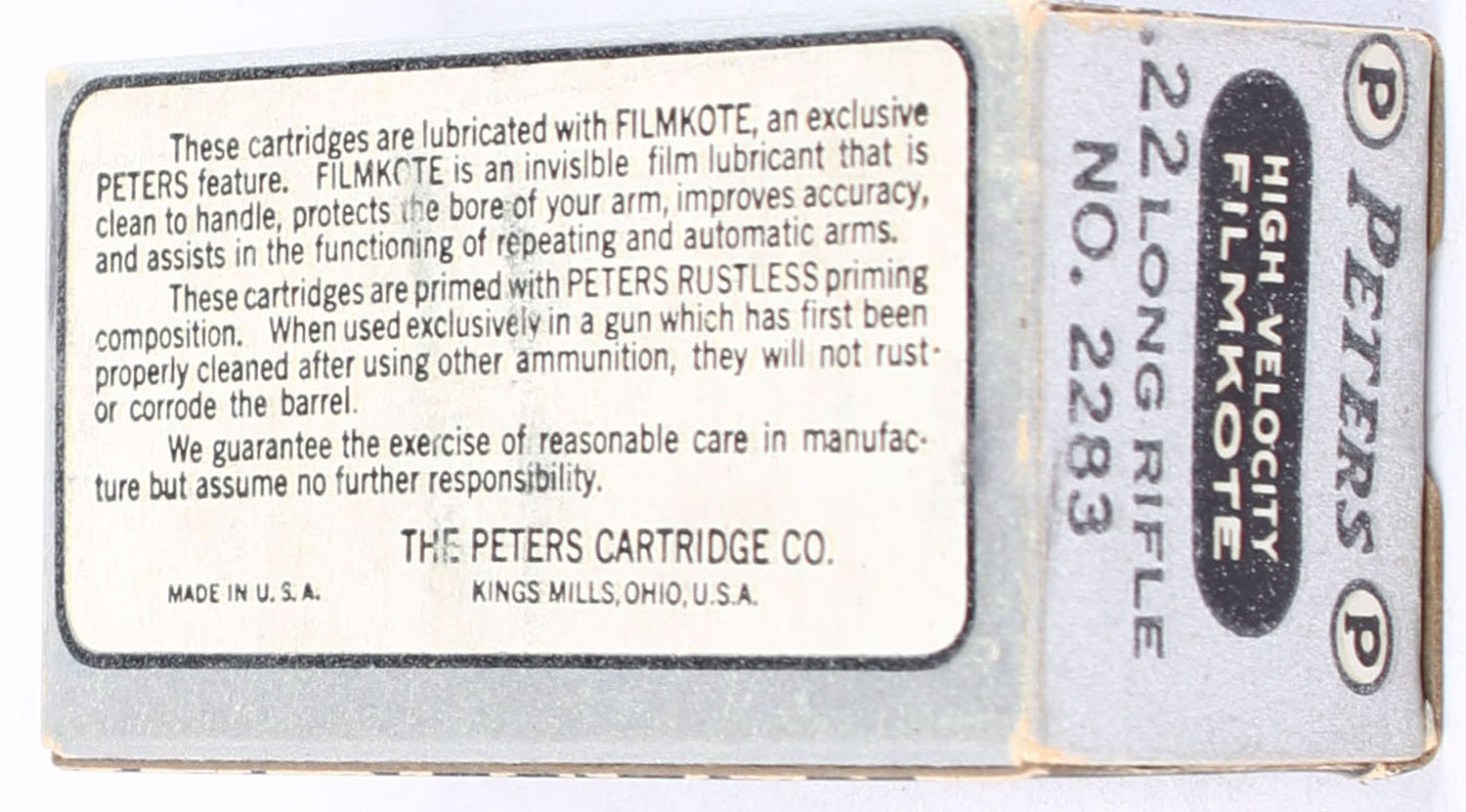 Peters, High Velocity Filmkote, .22 Long Rifle, RHWeb: PCC-13 LR-1a, Full, 1pc. Silver & black box, box is solid with excellent color, very minor corner wear, edges are mostly crisp, end flaps are solid, ammo is excellent. Grade: Excellent + - Value: 20 to 30