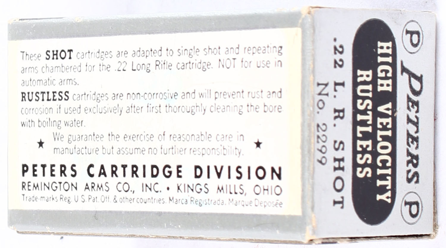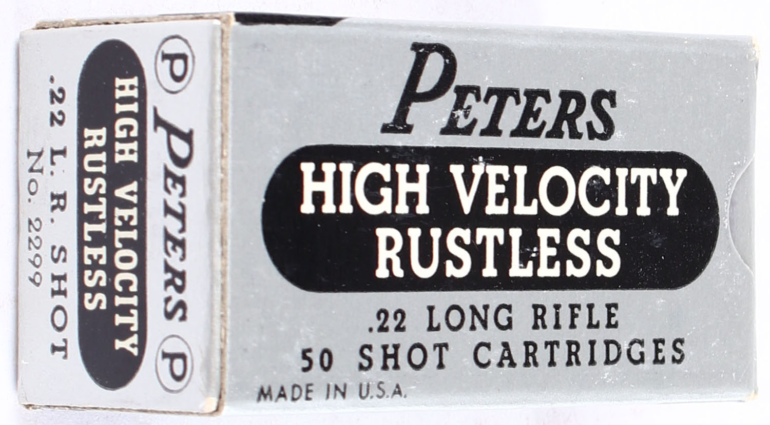Peters, High Velocity Rustless, .22 Long Rifle Shot, RHWeb: PCC-14 LR-3, Full, 1pc. Silver & black box, box is solid with excellent to minty color, very minor shelf wear, corners are mostly sharp, edges are crisp, end flaps are solid, ammo is excellent. Grade: Excellent ++ - Value: 40 to 60