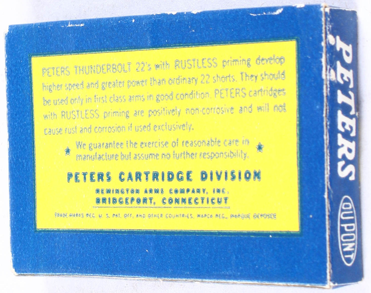 Peters, ''Thunderbolt'', .22 Short, RHWeb: PCC-17 S-5, Full, 1pc. Blue yellow & white flat pack, pack is solid with minty color, crease on top, very minor corner wear, edges are mostly crisp, end flaps are solid, ammo appears minty. Grade: Excellent - Value: 50 to 75