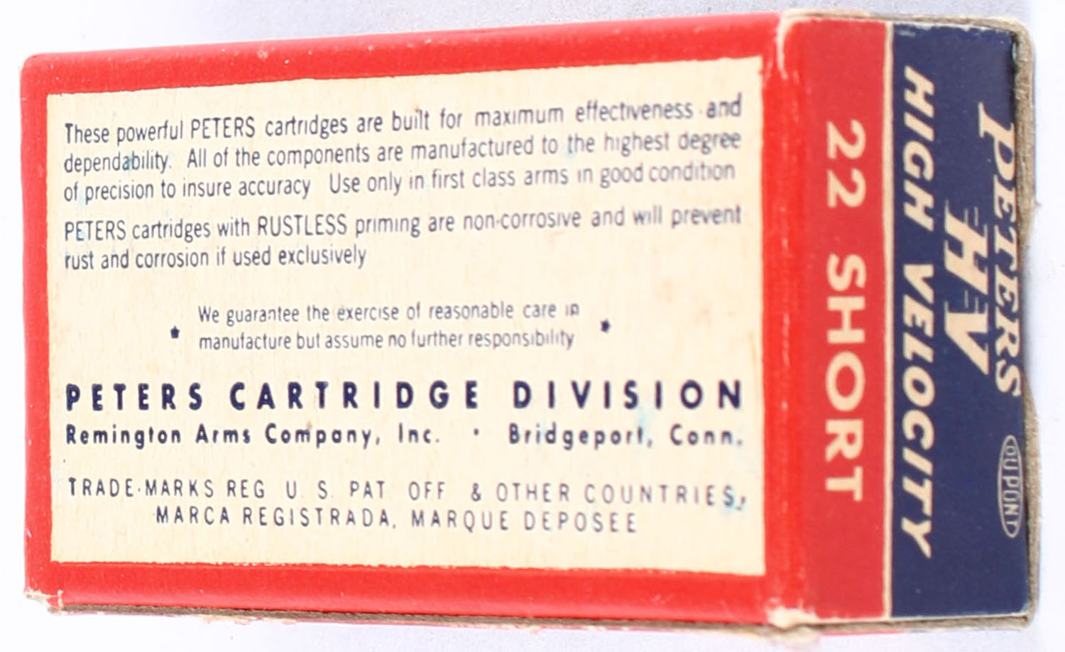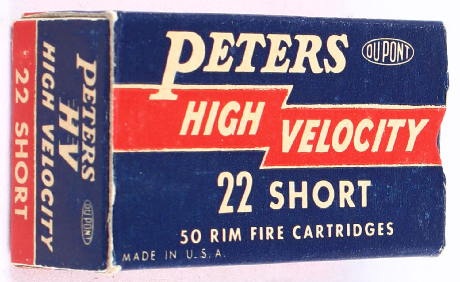Peters, High Velocity, .22 Short, RHWeb: PCC-17 S-1c, Full, 1pc. Blue red & white box, box is solid with excellent color, minor corner wear, edges are mostly crisp, end flaps are solid, ammo is excellent. Grade: Excellent - Value: 12 to 18