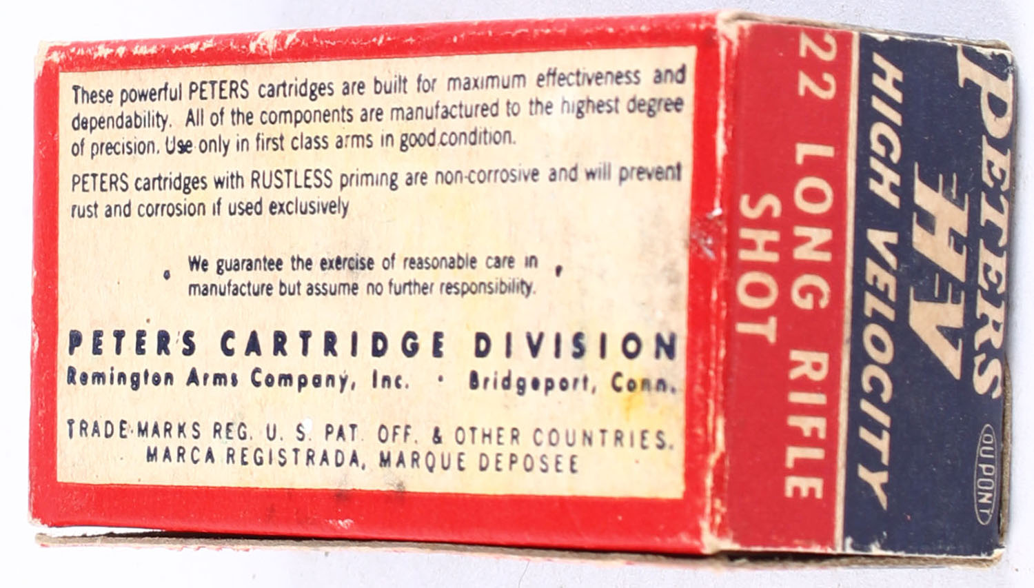 Peters, High Velocity, .22 Long Rifle Shot, RHWeb: PCC-17 LR-4c, Full, 1pc. Blue red & white box, box is solid with very good color, some age soiling & shelf wear, factory seam has unadhered, minor corner wear, very minor edge wear, end flaps are solid, ammo is excellent. Grade: Very Good - Value: 12 to 18