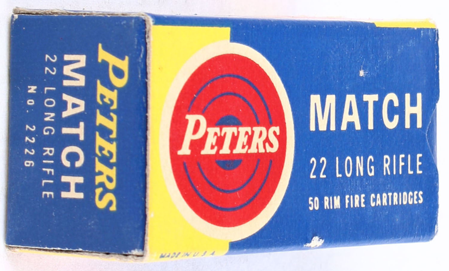 Peters, Match, .22 Long Rifle, For Rifle Shooting, RHWeb: PCC-55 LR-1d, Full, 1pc. Blue yellow & red box, box is solid with excellent color, very minor edge & corner wear, end flaps are solid, ammo is excellent. Grade: Excellent + - Value: 50 to 75