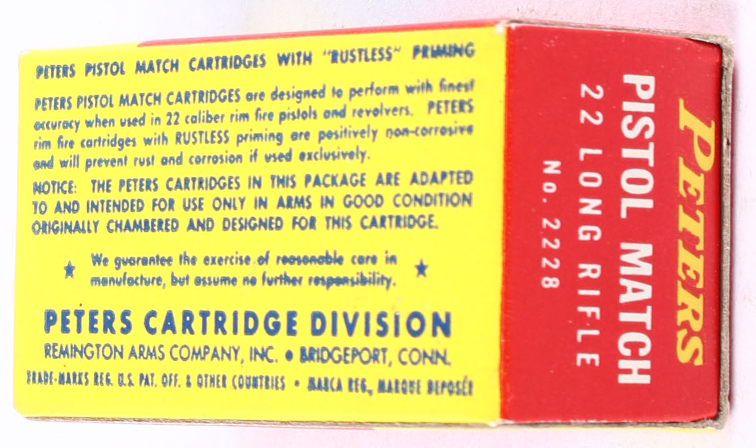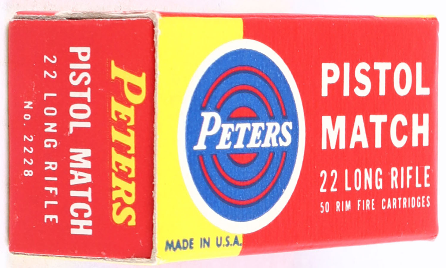 Peters, Pistol Match, .22 Long Rifle, For Use in Pistols and Revolvers Only, RHWeb: PCC-55 LR-1a, Full, 1pc. Red yellow & blue box, box is near mint with minty color, only very minor corner wear, edges are crisp, end flaps are solid, ammo is excellent. Grade: Excellent ++ - Value: 50 to 75