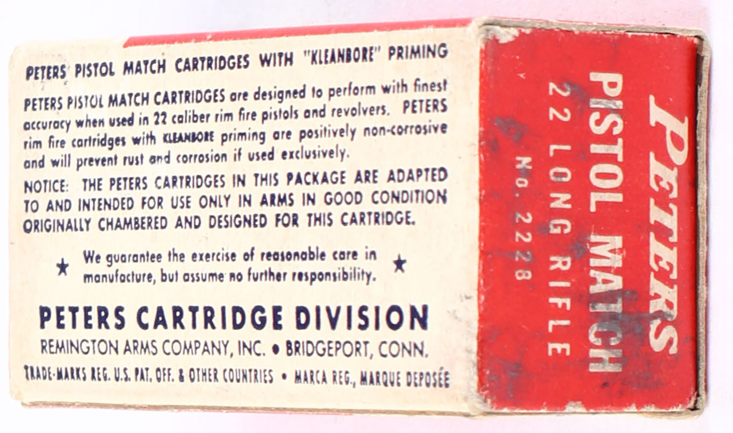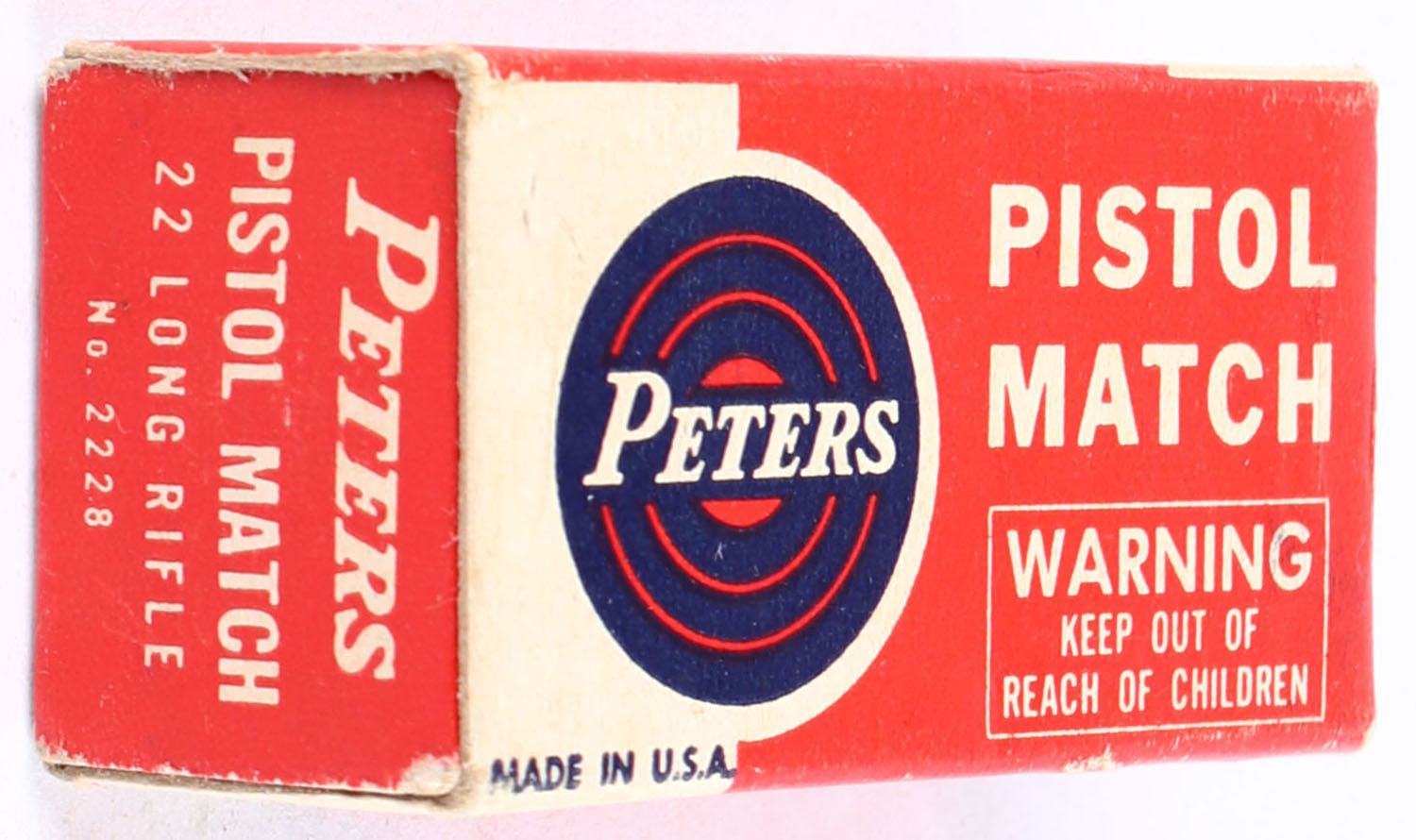 Peters, Pistol Match, .22 Long Rifle, For Use in Pistols and Revolvers Only, RHWeb: PCC-55 LR-5a, Partial 49rds., 1pc. Red white & blue box, box is solid with very good to excellent color, minor age soiling, very minor edge & corner wear, end flaps are solid, ammo is excellent. Grade: Very Good ++ - Value: 10 to 15