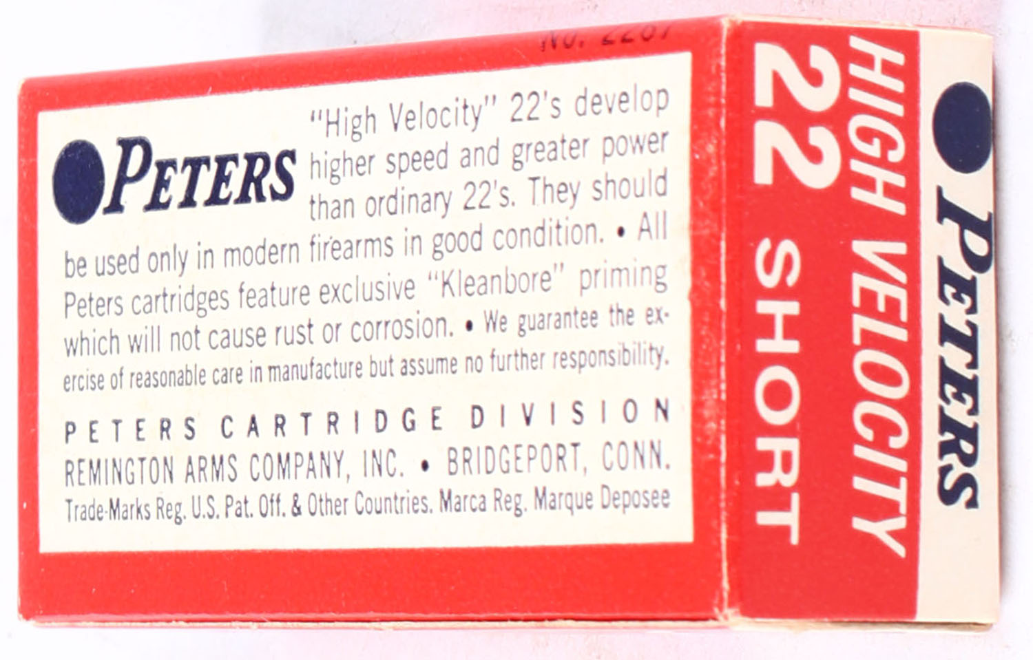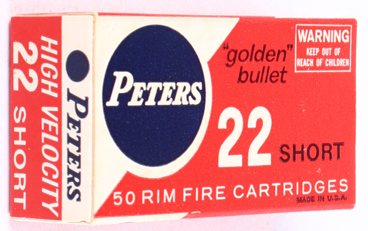 Peters, High Velocity, .22 Short, ''golden'' bullet, RHWeb: PCC-20 S-2b, Full, 1pc. Red white & blue box, box is solid with excellent color, very minor age soiling, corners are mostly sharp, edges are crisp, end flaps are solid, ammo is excellent. Grade: Excellent ++ - Value: 20 to 30