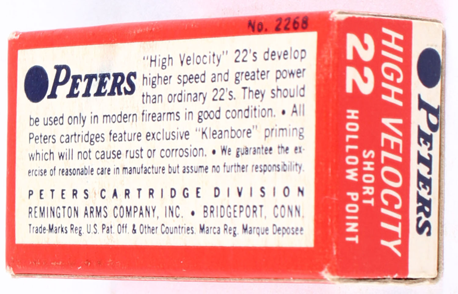 Peters, High Velocity, .22 Short Hollow Point, ''golden'' bullet, RHWeb: PCC-20 S-3b, Full, 1pc. Red white & blue box, box is solid with excellent color, very minor age soiling & corner wear, edges are crisp, end flaps are solid, ammo is excellent. Grade: Excellent - Value: 24 to 36