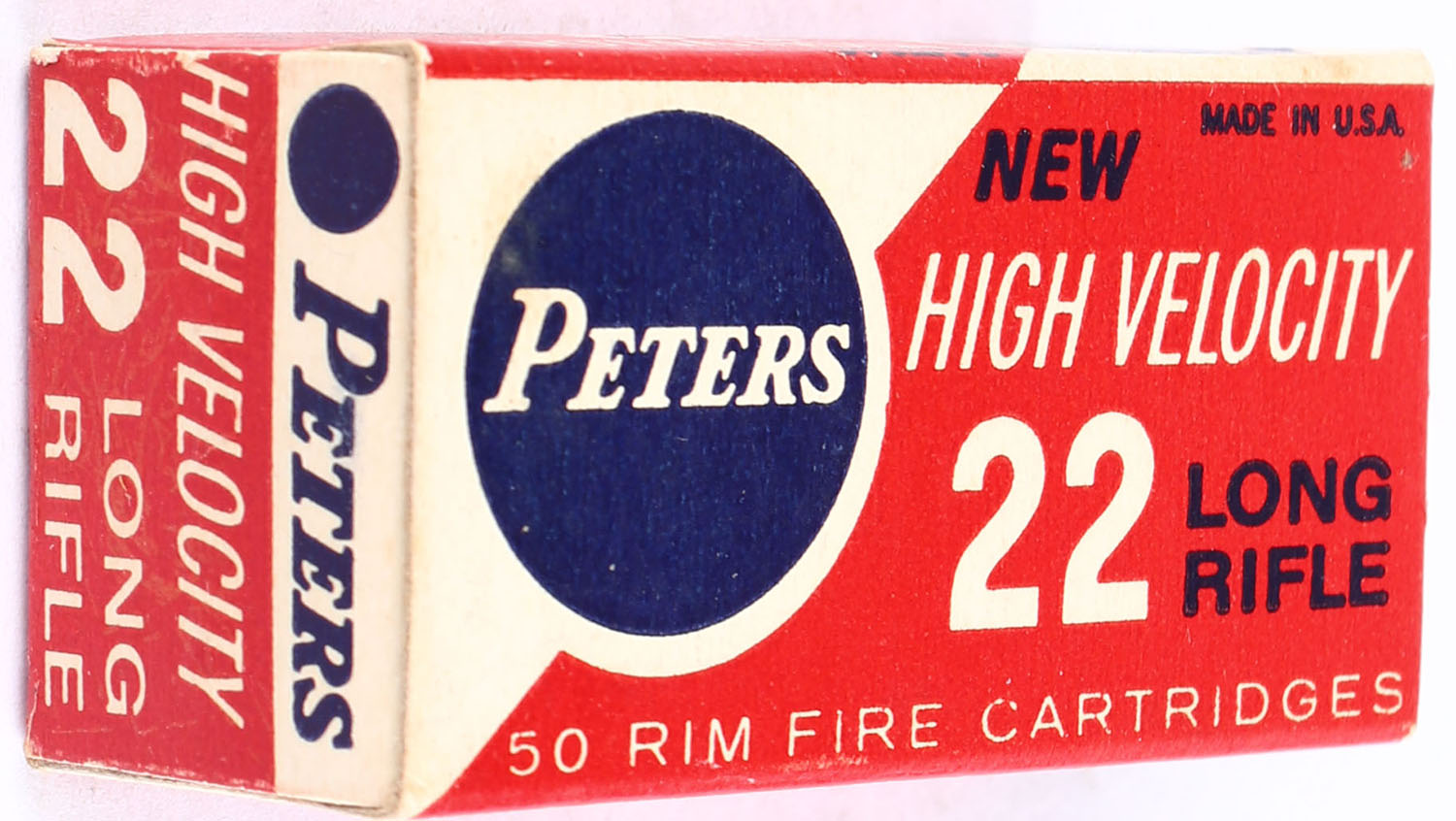 Peters, New High Velocity, .22 Long Rifle, RHWeb: PCC-18 LR-1, Full, 1pc. Red white & blue box, box is solid with excellent color, very minor age soiling & corner wear, end flaps are solid, ammo is excellent. Grade: Excellent - Value: 12 to 18