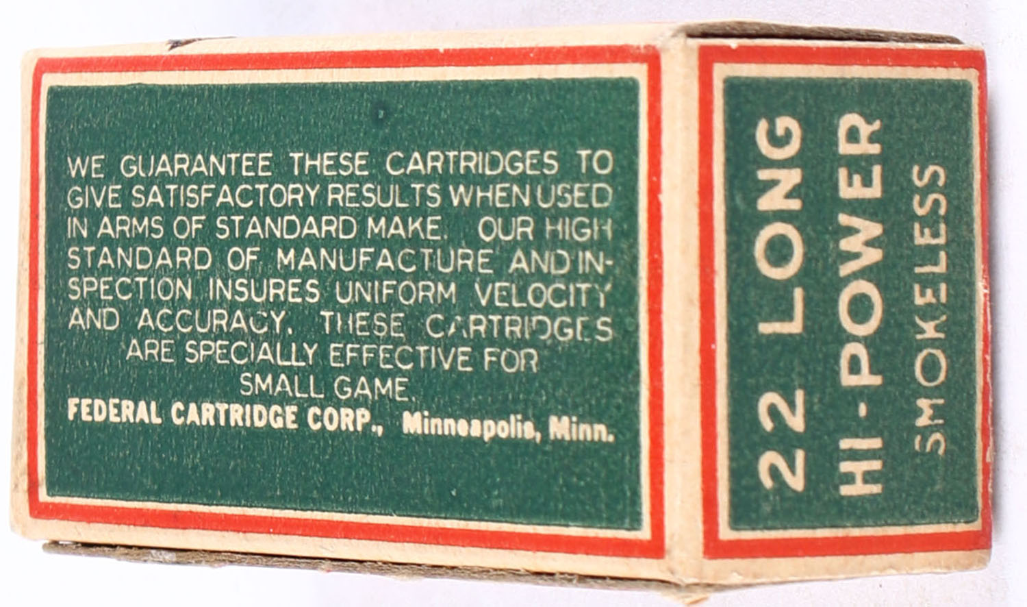 Federal, Hi-Power, .22 Long, Smokeless, RHWeb: FCC-1 L-2, Full, 1pc. Gren red & buff box, box is solid with very good to excellent color, minor age soiling, stain on front, very minor corner wear, edges are crisp, end flaps are solid, ammo is good to very good. Grade: Very Good ++ - Value: 160 to 240