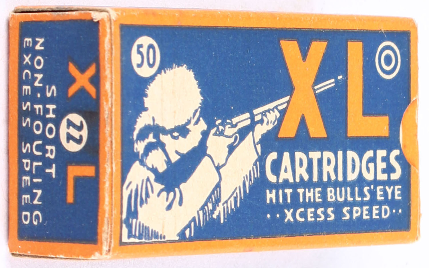 Federal, XL Cartridges, .22 Short, RHWeb: FCC-4.1 S-2d, Full, 1pc. Blue orange & white box, box is solid with excellent color, very minor age soiling & corner wear, edges are crisp, end flaps are solid, ammo is excellent. Grade: Excellent + - Value: 160 to 240