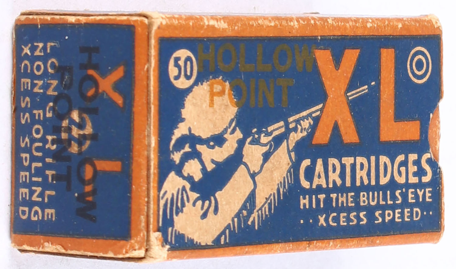 Federal, XL Cartridges, .22 Long Rifle Hollow Point, RHWeb: FCC-4.1 LR-2b, Full, 1pc. Blue orange & white box, box is solid with very good color, minor age soiling & corner wear, very minor edge wear, end flaps are solid, ammo is excellent. Grade: Very Good ++ - Value: 150 to 225