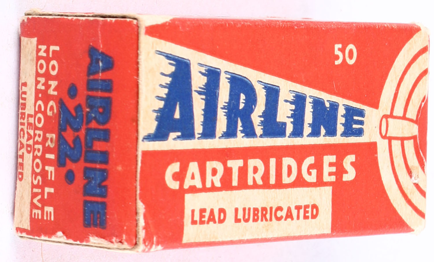 Federal, Airline Cartridges, .22 Long Rifle, Lead Lubricated, RHWeb: FCC-4.3 LR-1b, Full, 1pc. Red white & blue box, box is solid with very good to excellent color, minora age soiling, some corner wear, edges are mostly crisp, end flaps are solid, ammo is excellent. Grade: Excellent - Value: 40 to 60
