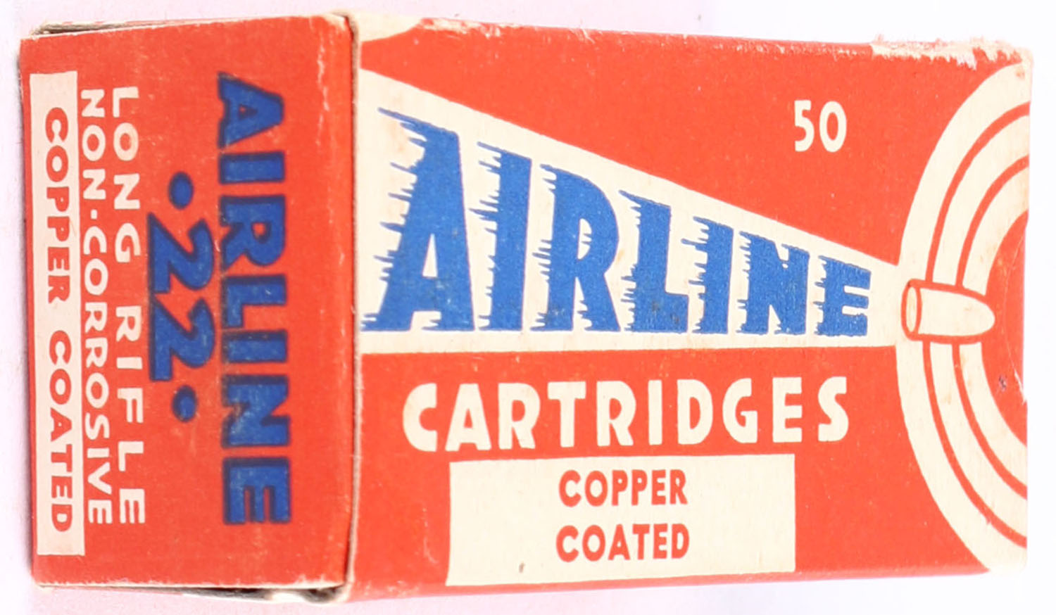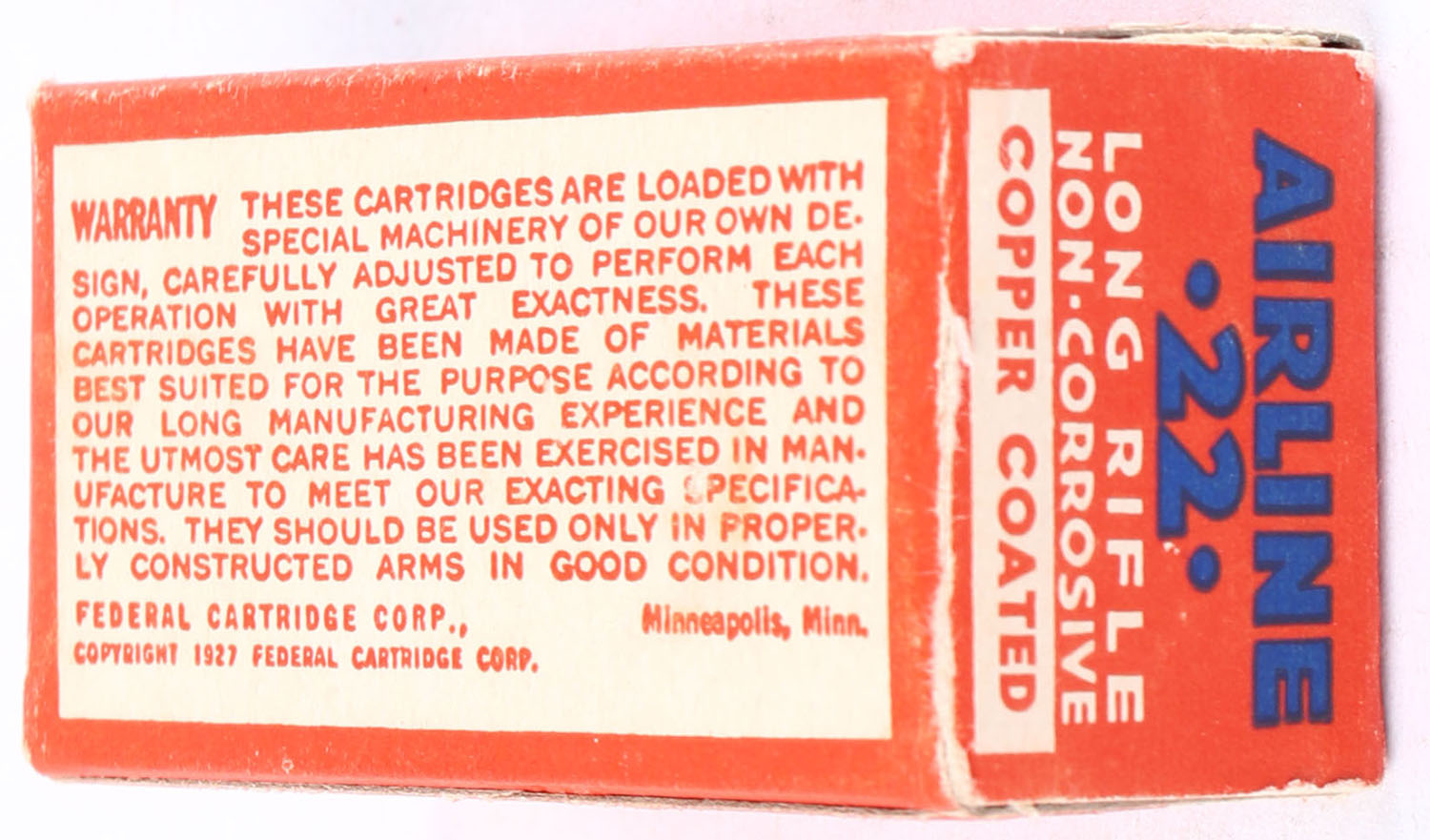 Federal, Airline Cartridges, .22 Long Rifle, Copper Coated, RHWeb: FCC-4.3 LR-2b, Full, 1pc. Red white & blue box, box is solid with excellent color, partial seam split to right end flap, very minor corner wear, edges are crisp, left end flap is solid, ammo is excellent to minty. Grade: Excellent - Value: 60 to 90