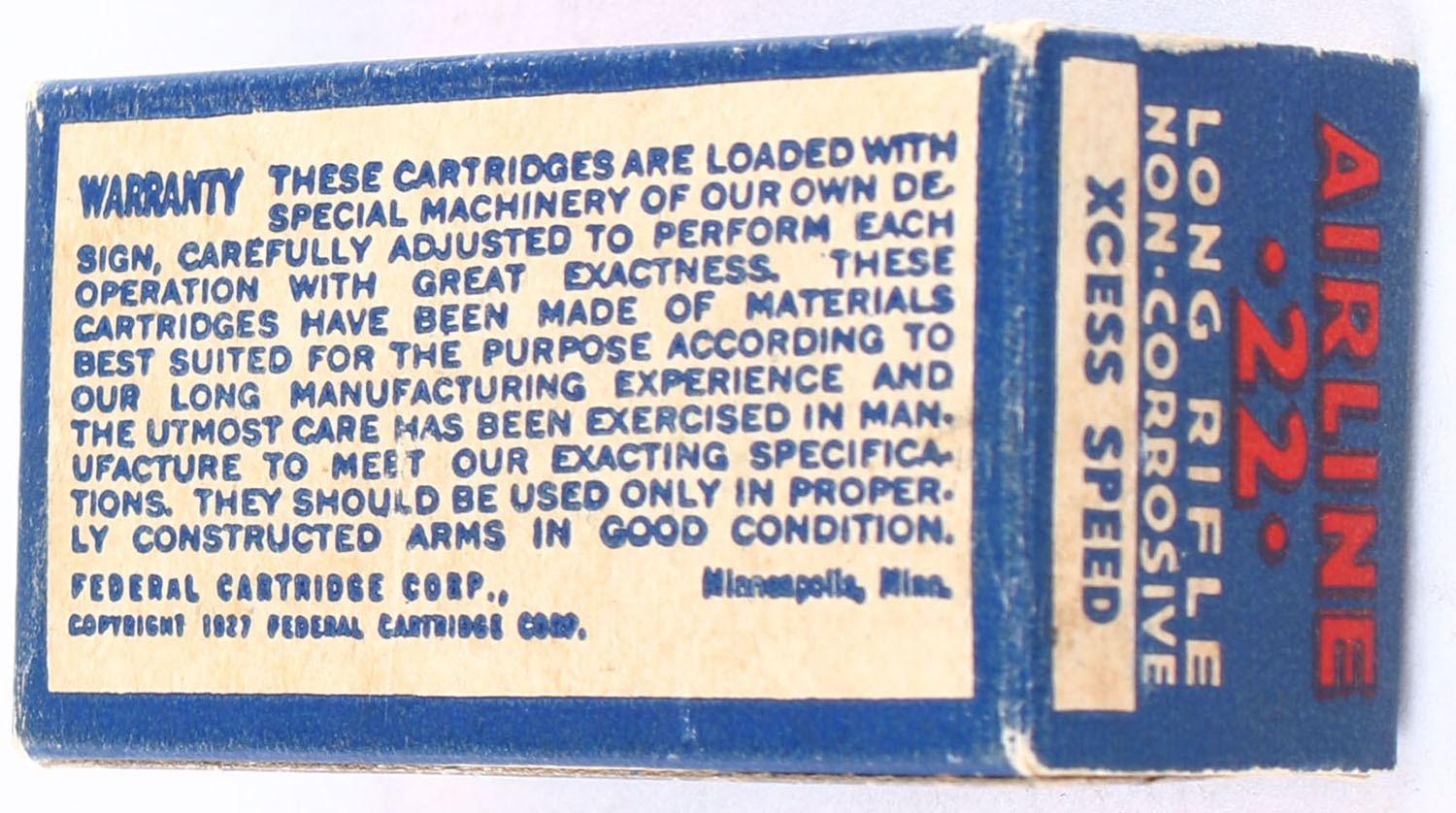 Federal, Airline Cartridges, .22 Long Rifle, Xcess Speed Lead Lubricated, RHWeb: 4.3 LR-9b, Full, 1pc. Blue white & red box, box is solid with very good color, some age soiling, very minor corner wear, edges are crisp, end flaps are solid, ammo is excellent. Grade: Very Good ++ - Value: 30 to 45