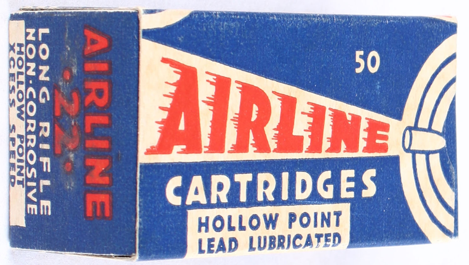 Federal, Airline Cartridges, .22 Long Rifle Hollow Point, RHWeb: FCC-4.3 LR-10b, Full, 1pc. Blue white & red box, box is solid with excellent color, minor age soiling, very minor corner wear, edges are crisp, end flaps are solid, ammo is excellent. Grade: Excellent + - Value: 50 to 75