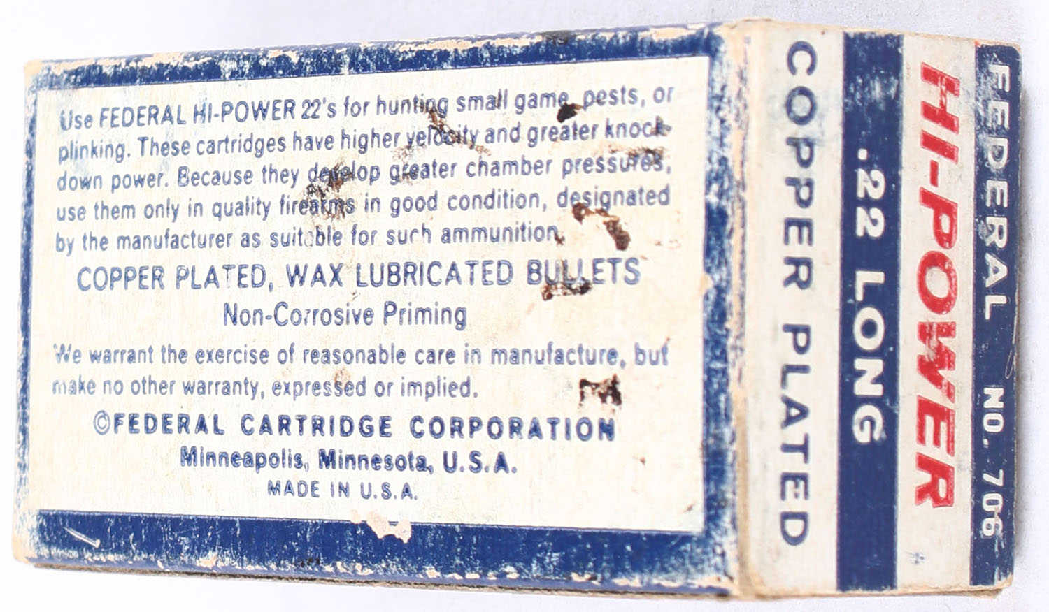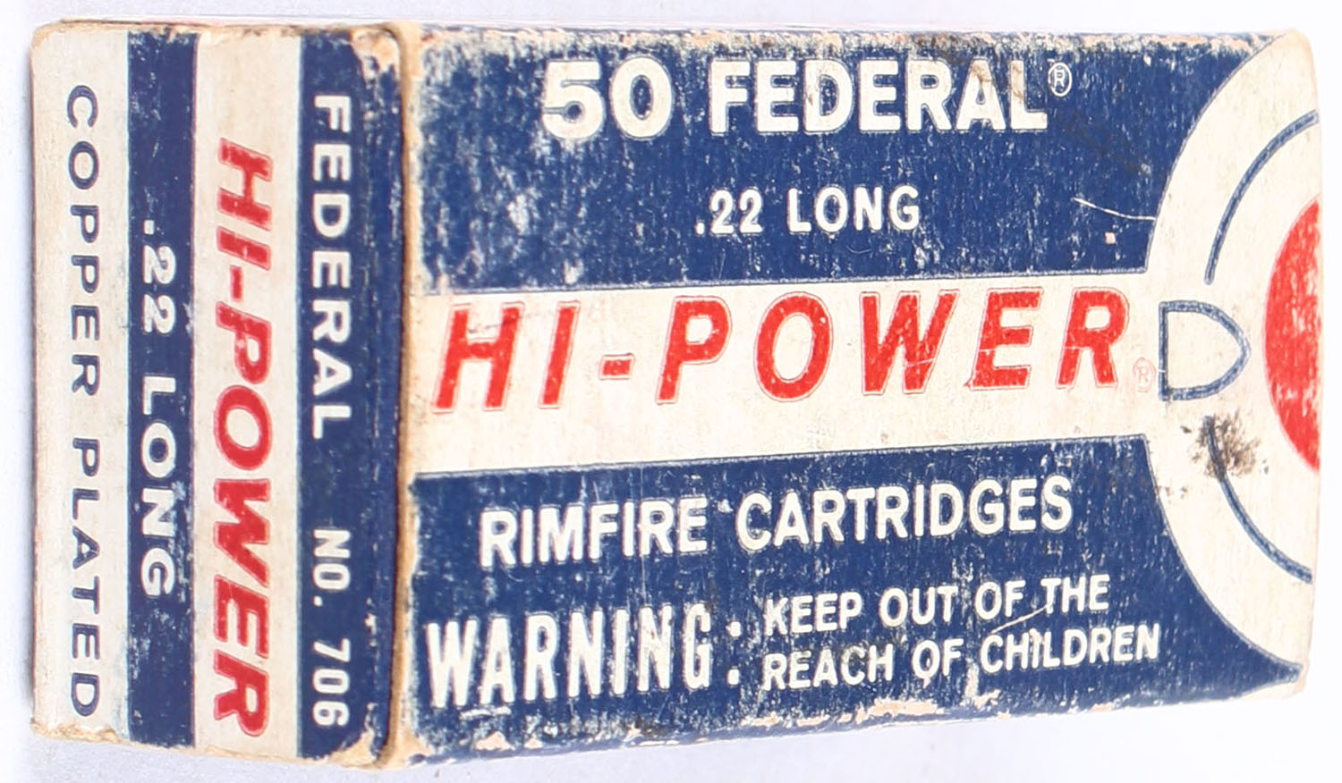 Federal, Hi-Power, .22 Long, Copper Plated, RHWeb: FED-8 L-1, Full, 1pc. Blue white & red box, box is solid with good color, minor age soiling & staining, shelf wear, some edge & corner wear, end flaps are solid, ammo is excellent. Grade: Good ++ - Value: 8 to 12