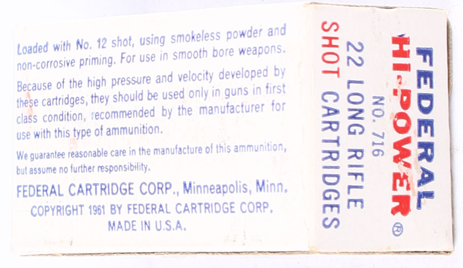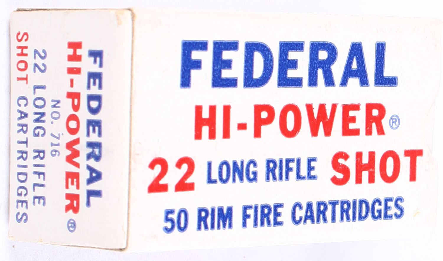 Federal, Hi-Power, .22 Long Rifle Shot, RHWeb: FED-8 LR-5a, Full, 1pc. White blue & red box, box is solid with excellent color, very minor age soiling, corners are mostly sharp, edges are crisp, end flaps are solid, ammo is excellent. Grade: Excellent ++ - Value: 40 to 60