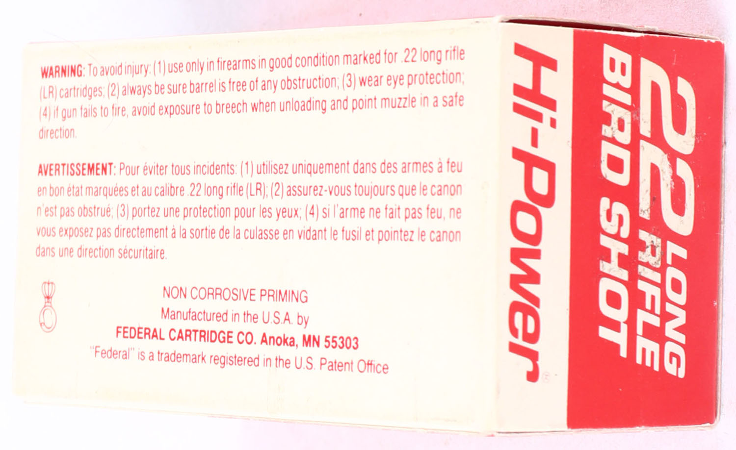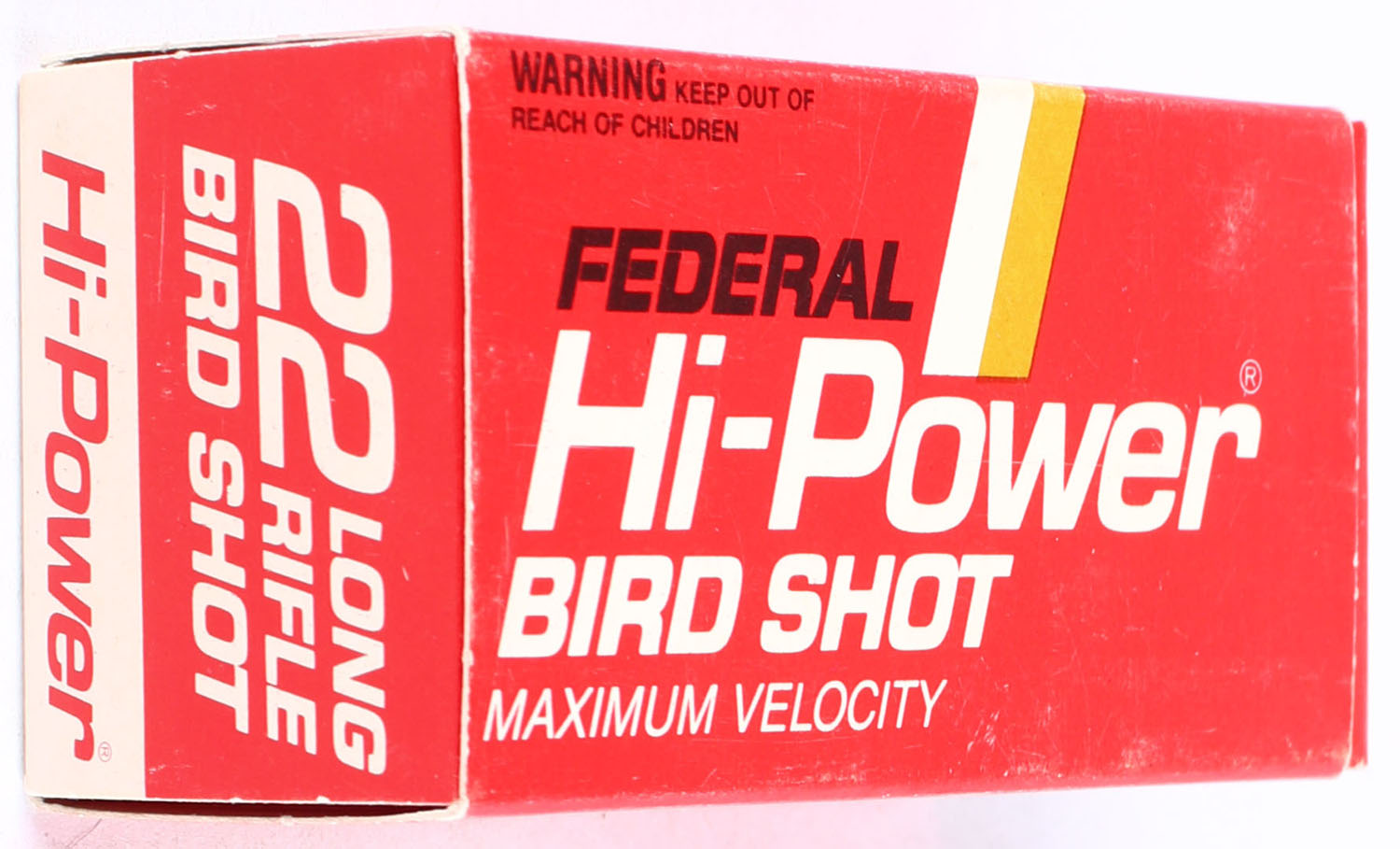 Federal, Hi-Power Bird Shot, .22 Long Rifle Shot, Maximum Velocity, RHWeb: FED-10 LR-8b, full, 1pc. Red & white box, box is solid with excellent color, very minor shelf wear, corners are mostly sharp, edges are mostly crisp, end flaps are solid, ammo is excellent. Grade: Excellent ++ - Value: 16 to 24