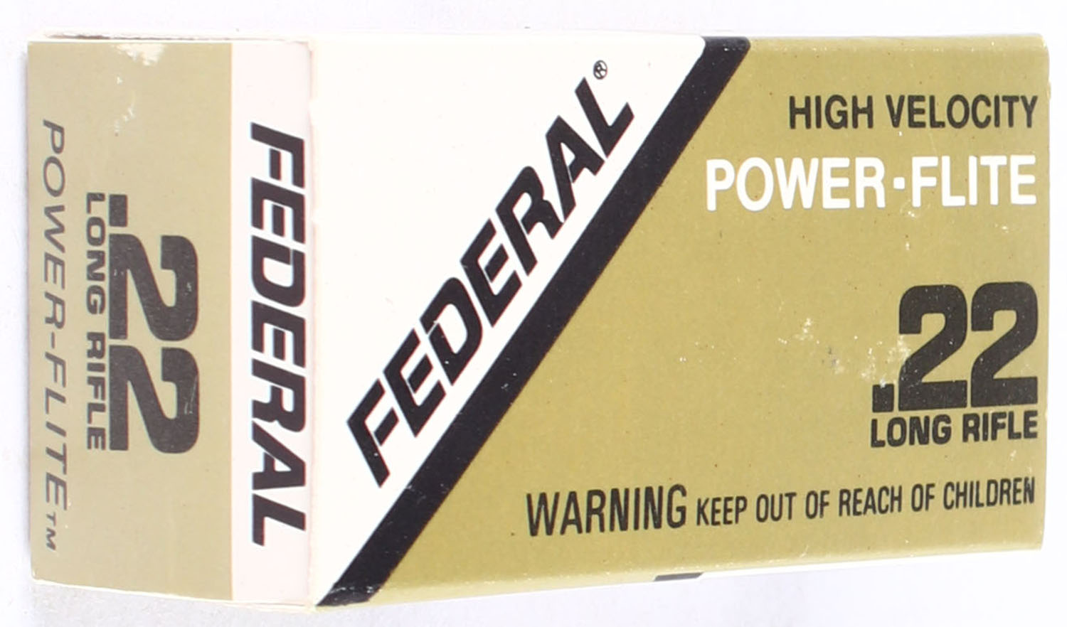 Federal, Power-Flite, .22 Long Rifle, RHWeb: FED-12 LR-3 Full, 1pc. Gold white & black box, box is near mint with minty color, only very minor shelf wear, corners are sharp, edges are crisp, end flaps are solid, ammo is minty. Grade: Excellent ++ - Value: 10 to 15