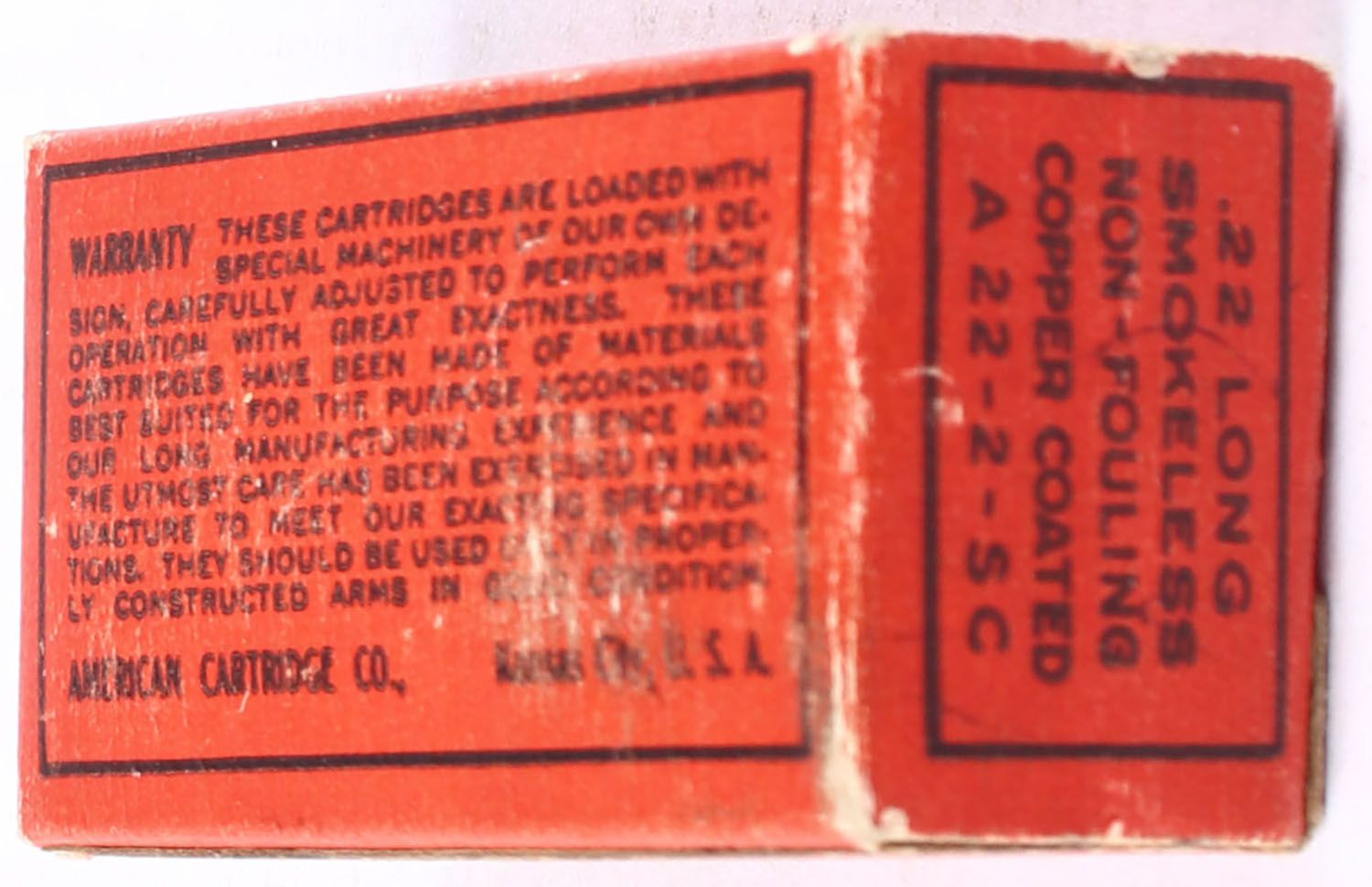 American, American Eagle, .22 Long, Copper Coated, Non-Fouling, RHWeb: ACC-1 L-2 Partial 35rds. 1pc. Red black & white box, box is solid with excellent color, very minor age soiling, minor shelf wear, some corner wear, edges are mostly crisp, end flaps are solid, ammo is excellent. Grade: Very Good ++ - Value: 50 to 75