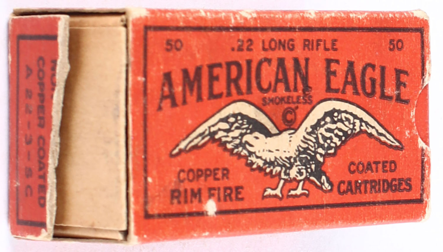 American, American Eagle, .22 Long Rifle, Copper Coated, Non-Fouling, RHWeb: ACC-1 LR-2a, Partial 48rds. 1pc. Red black & white box, left end flap is torn, very good color, minor age soiling, some edge & corner wear, right end flap is solid, ammo is excellent. Grade: Very Good - Value: 10 to 15