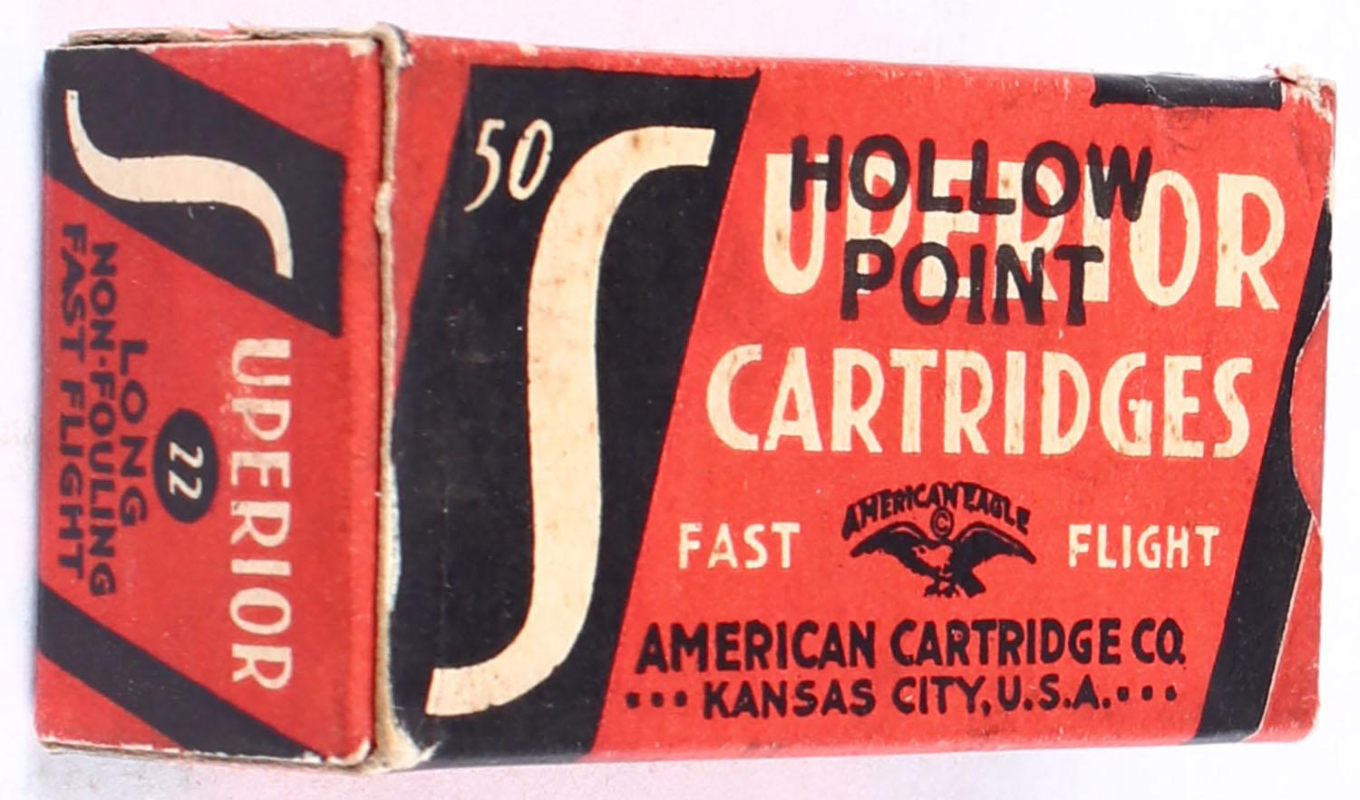 American, Superior Cartridges, .22 Long Hollow Point, RHWeb: ACC-2 L-2, Full, 1pc. Red black & buff box with ''Hollow Point'' over-stamp, box is solid with very good to excellent color, minor age soiling, some corner wear, edges are crisp, end flaps are solid, ammo is excellent. Grade: Very Good ++ - Value: 80 to 120