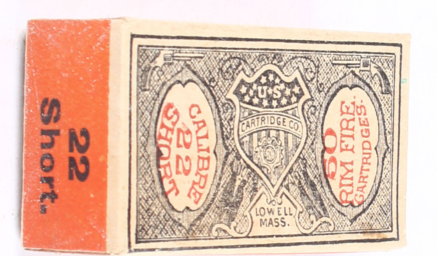 U.S., Rim Fire Cartridges, .22 Short, Target Cartridges, RHWeb: US-3 S-2, Full, 1pc. Gray orange & buff box, box is solid with excellent color, very minor age soiling & corner wear, edges are crisp, end flaps are solid, ammo is fair. Grade: Excellent + - Value: 300 to 450
