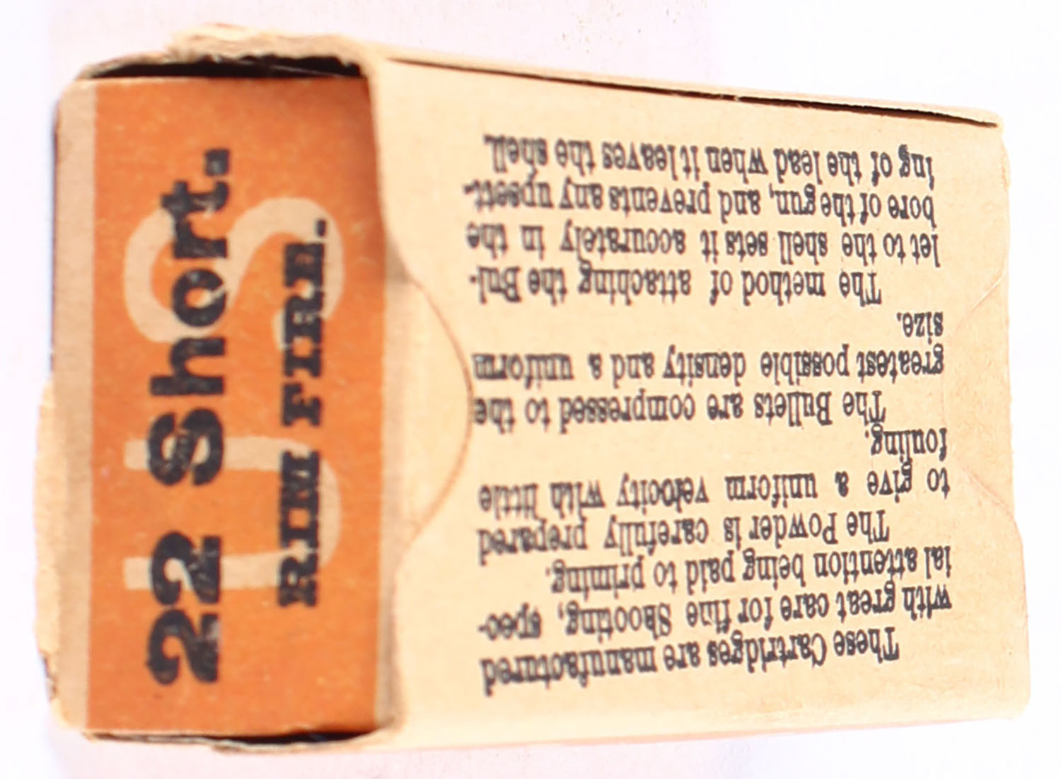 U.S., Metallic Cartridges, .22 Short, Target Cartridges, RHWeb: US-5 S-1, Partial 27rds. 1pc. Red orange & buff box, box is torn down the middle lengthwise on front & back sides, front & back have been taped on the inside of the box, very minor shelf & corner wear, edges are mostly crisp, ammo is very good. Grade: Good - Value: 20 to 30