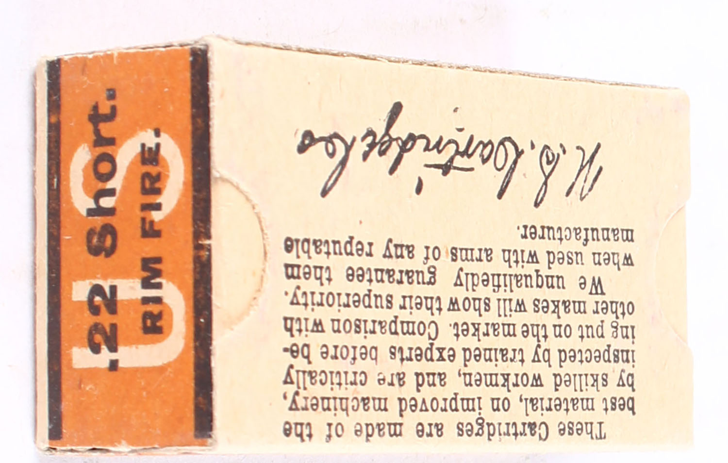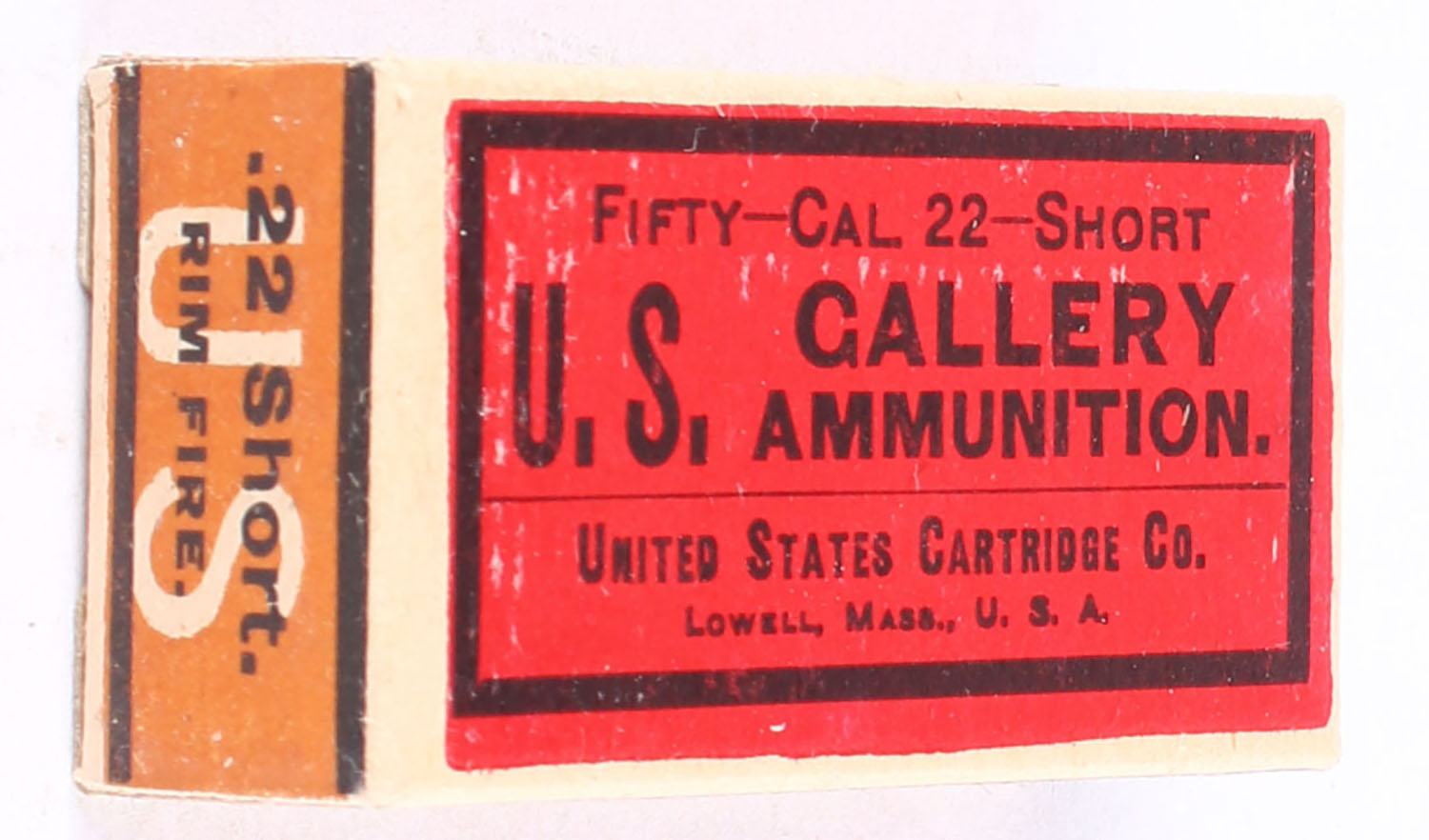 U.S., Gallery Ammunition, .22 Short, Rifle Cartridges, RHWeb: US-50A S-1e, Full, 1pc. Red orange & buff box, box is solid with excellent to minty color, very minor shelf wear, corners are mostly sharp, edges are crips, end flaps are solid, ammo is very good. Grade: Excellent + - Value: 100 to 150