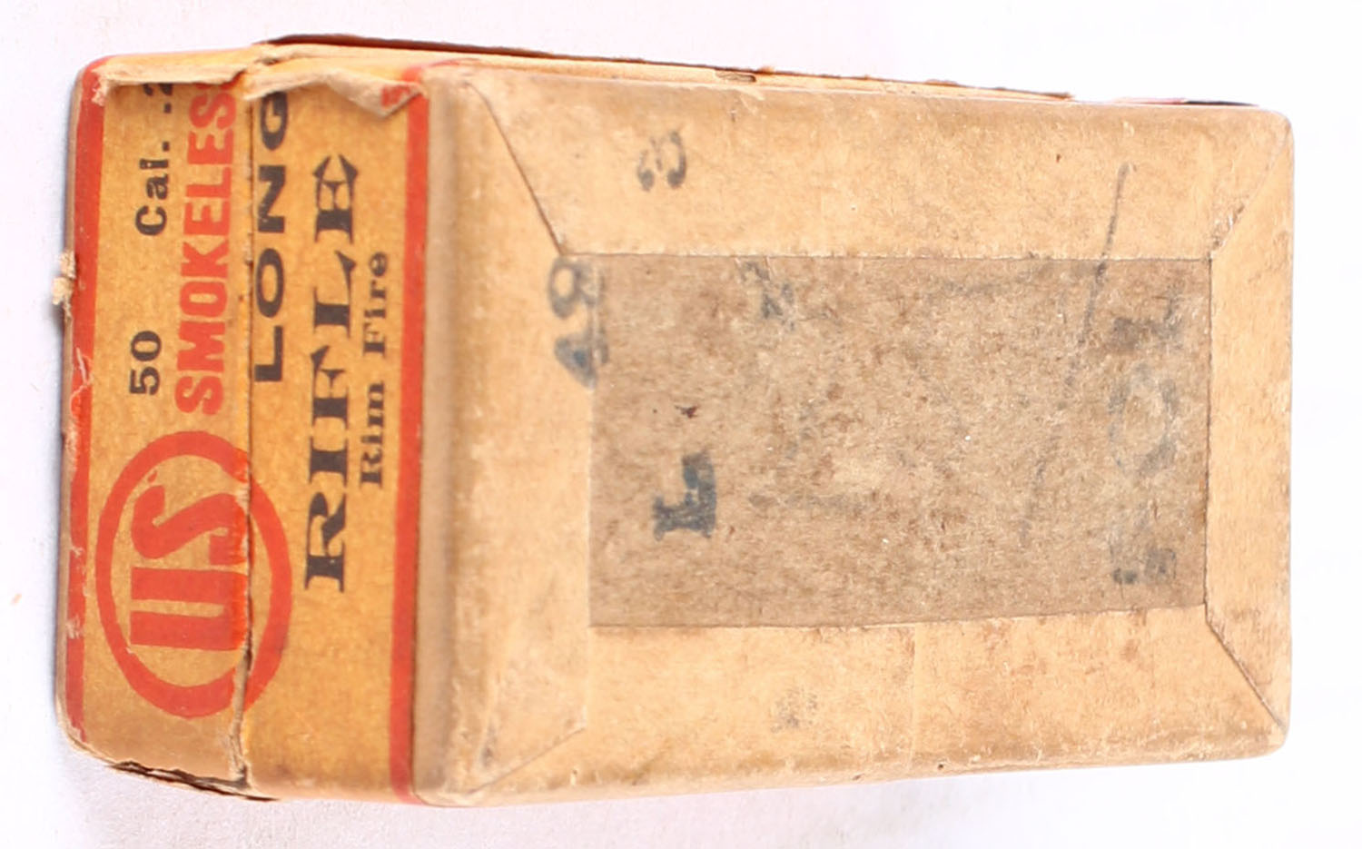 U.S., Smokeless Rim Fire Cartridges, .22 Long Rifle, RHWeb: US-6 LR-4, Partial 45rds. 2pc. Buff box with orange/red top & side sealing labels, box is solid with very good color, some age soiling, vertical seam split to front right corner of lid, minor edge & corner wear, end flaps are solid, ammo is very good. Grade: Very Good ++ - Value: 24 to 36