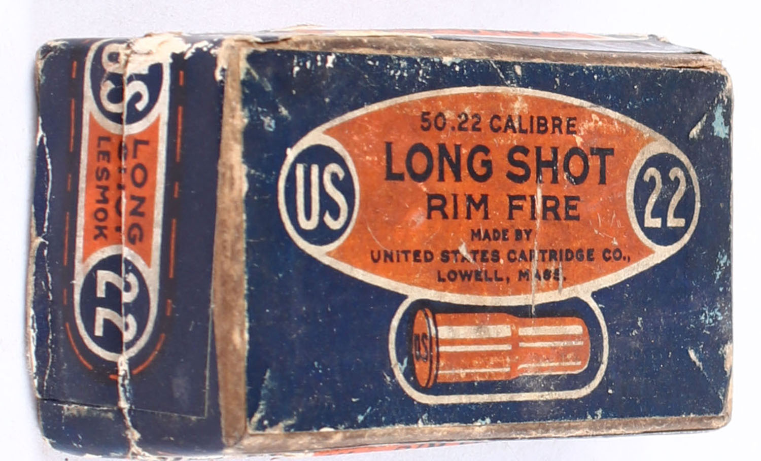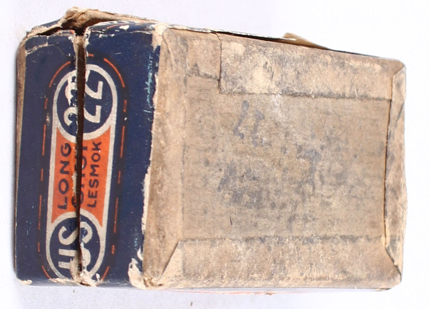 U.S., Rim Fire, .22 Long Shot, Lesmok, RHWeb: US-7 L-1a, Partial 33rds. 2pc. Buff box with blue/orange top & side sealing labels, box is solid with very good color, some age soiling & shelf wear, some edge & corner wear, labels are intact, ammo is excellent. Grade: Very Good + - Value: 30 to 45