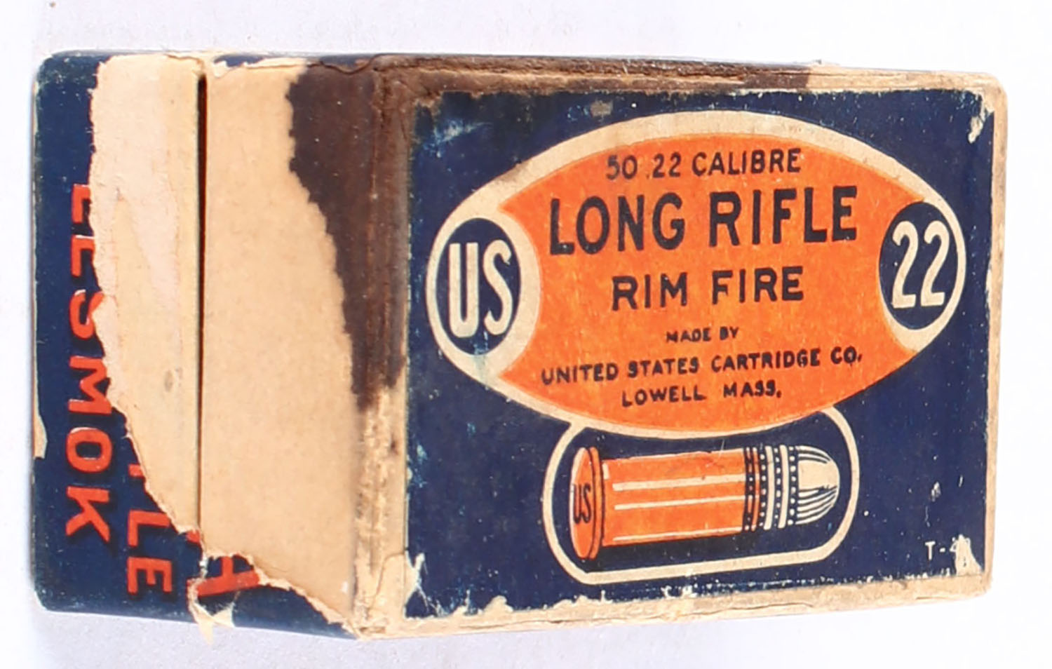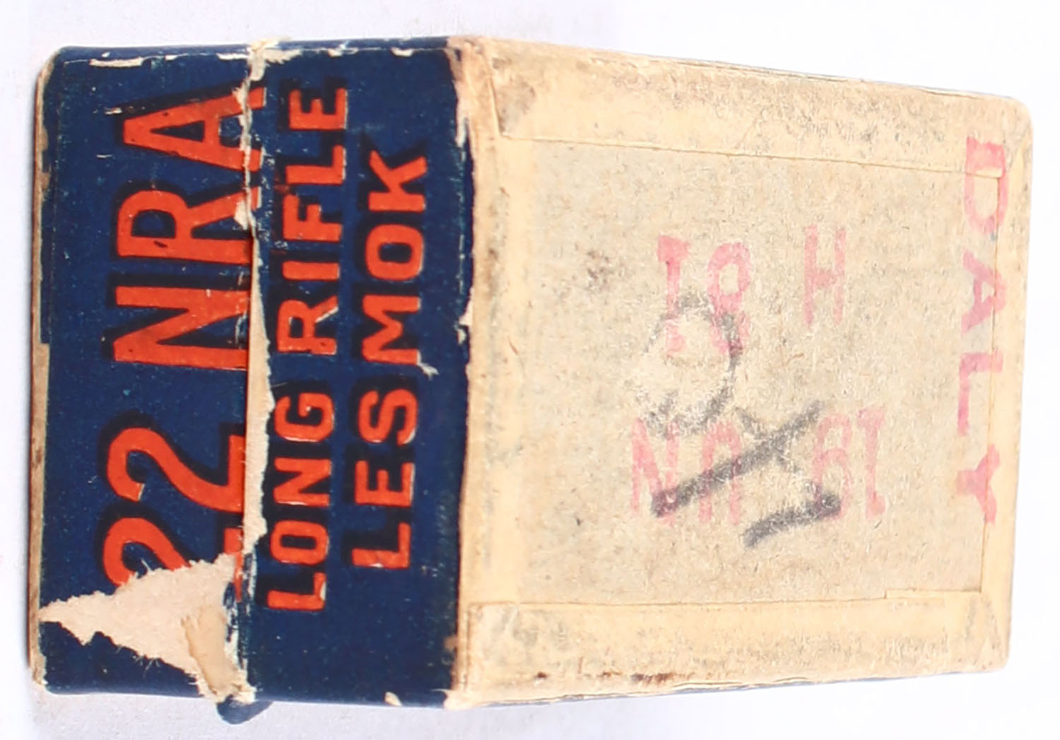 U.S., 22 NRA, .22 Long Rifle, Lesmok, RHWeb: US-51 LR-5, Partial 49rds. 2pc. Buff box with blue/orange top & side sealing labels, box is solid with very good color, minor age soiling, stain on top, some edge & corner wear, side sealing label is 80% intact, ammo is good to very good. Grade: Very Good - Value: 10 to 15
