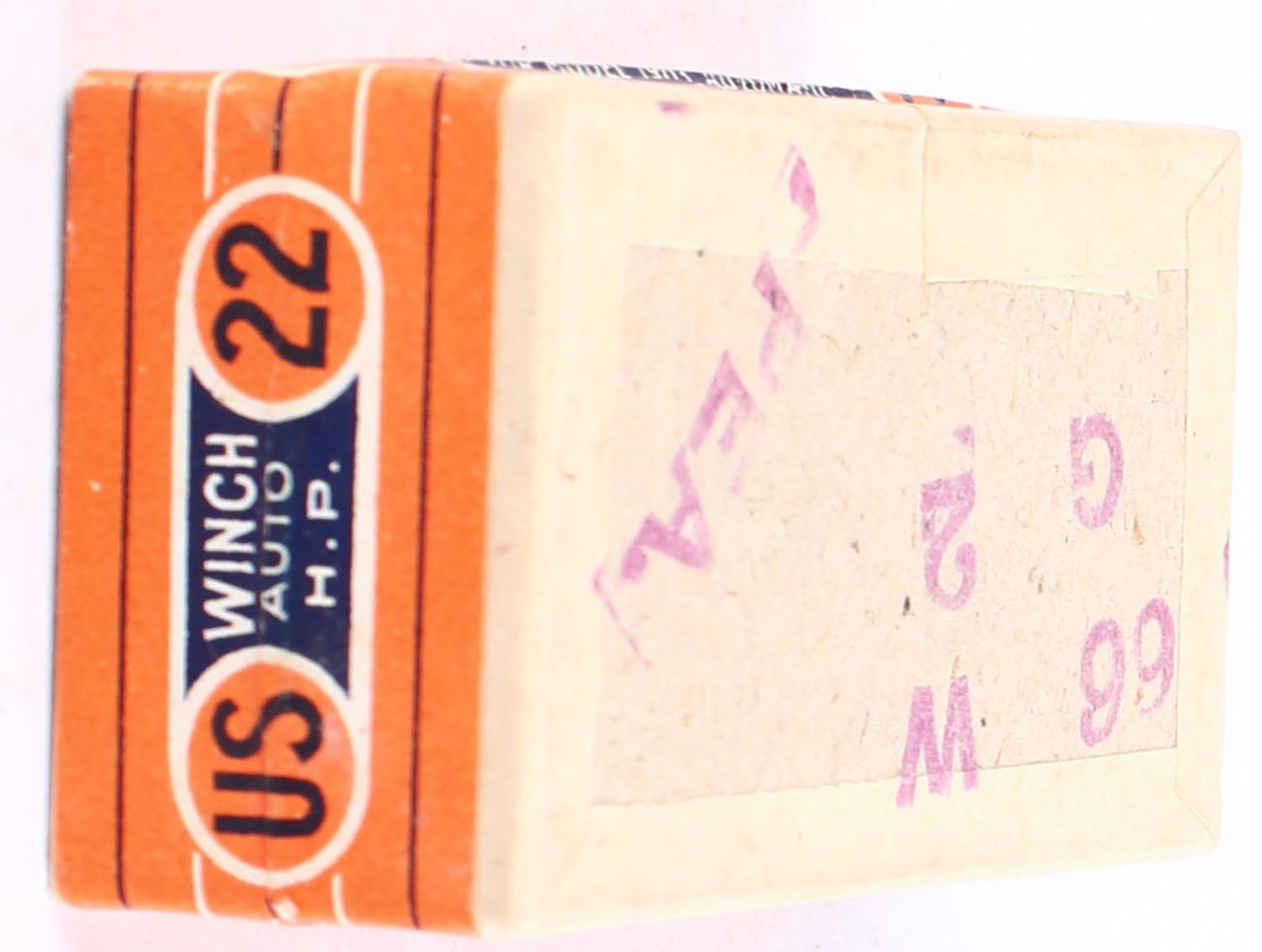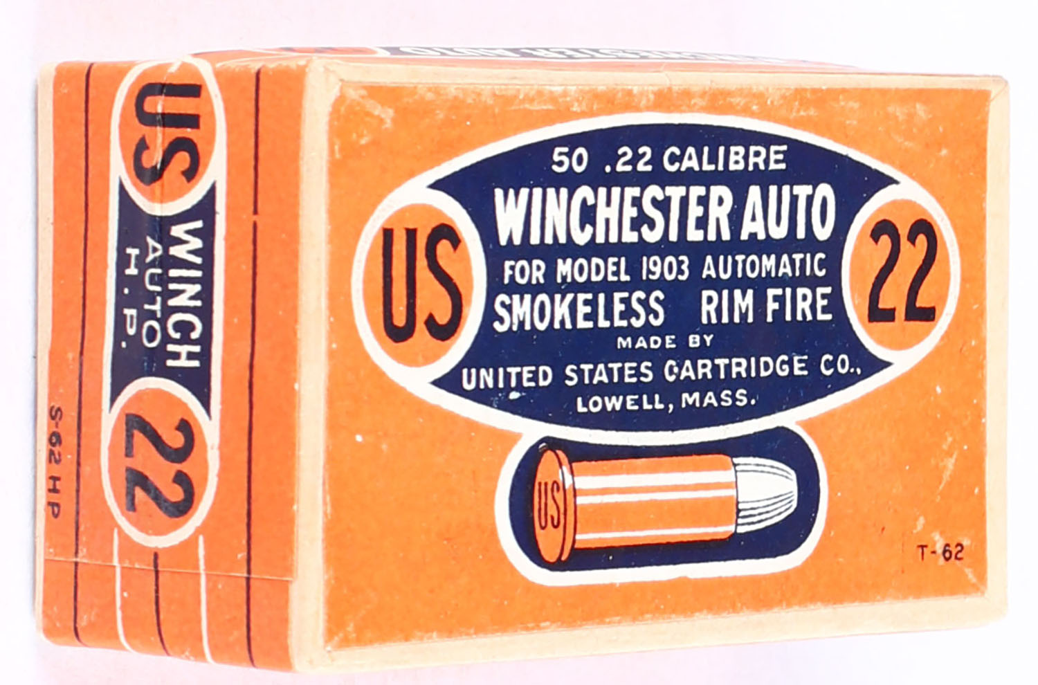 U.S., Smokeless Rim Fire, .22 Winchester Auto Hollow Point, No Grease, RHWeb: US-7 WA-2, FULL & SEALED, 2pc. Buff box with orange/blue top & side sealing labels, box is solid with excellent color, very minor shelf wear, corners are sharp, edges are crisp, labels are intact. Grade: Excellent ++ - Value: 220 to 330