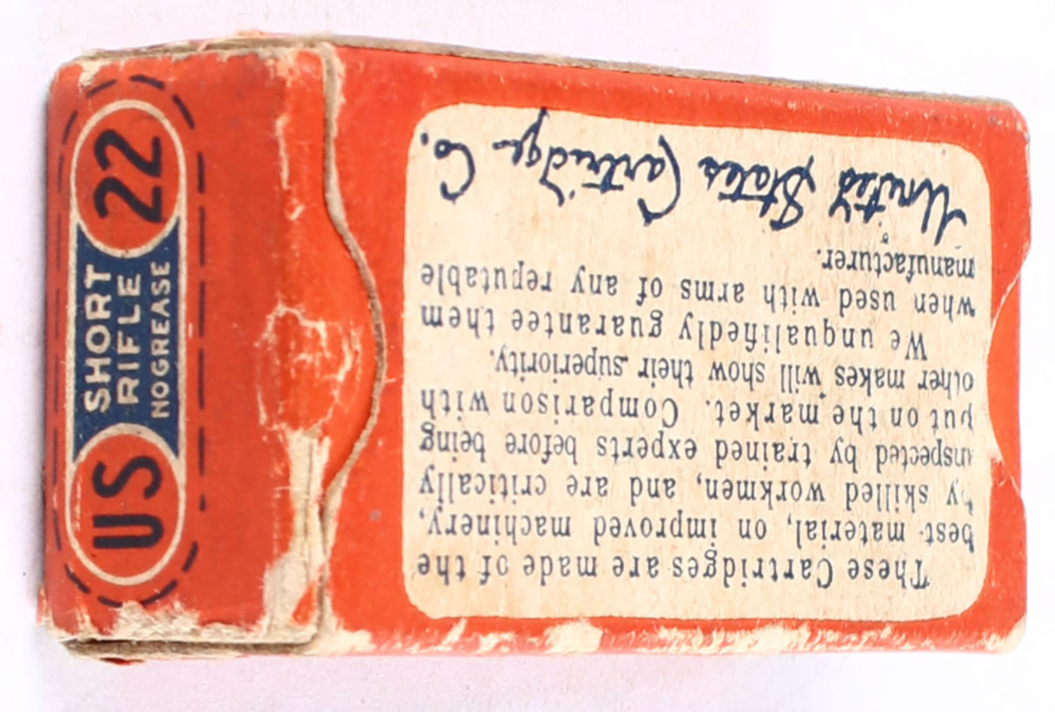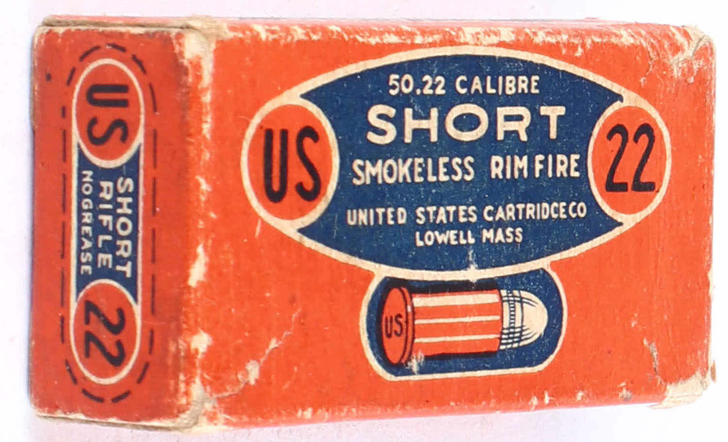 U.S., Smokeless Rim Fire, .22 Short, No Grease, RHWeb: US-8 S-4f, Full, 1pc. Orange blue & white box, box is solid with very good color, some age soiling, small tear to left end flap, some corner wear, minor edge wear, end flaps are solid, ammo is excellent. Grade: Very Good - Value: 30 to 45
