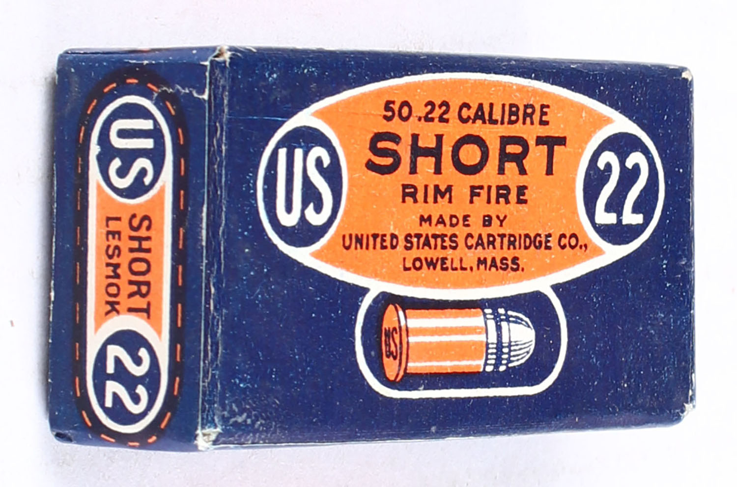 U.S., Rim Fire, .22 Short, Lesmok, RHWeb: US-8 S-2b, FULL & SEALED, 1pc. Blue orange & white box with blue & orange side sealing label, box is solid with excellent color, very minor corner wear, edges are crisp, label is intact. Grade: Excellent + - Value: 30 to 45
