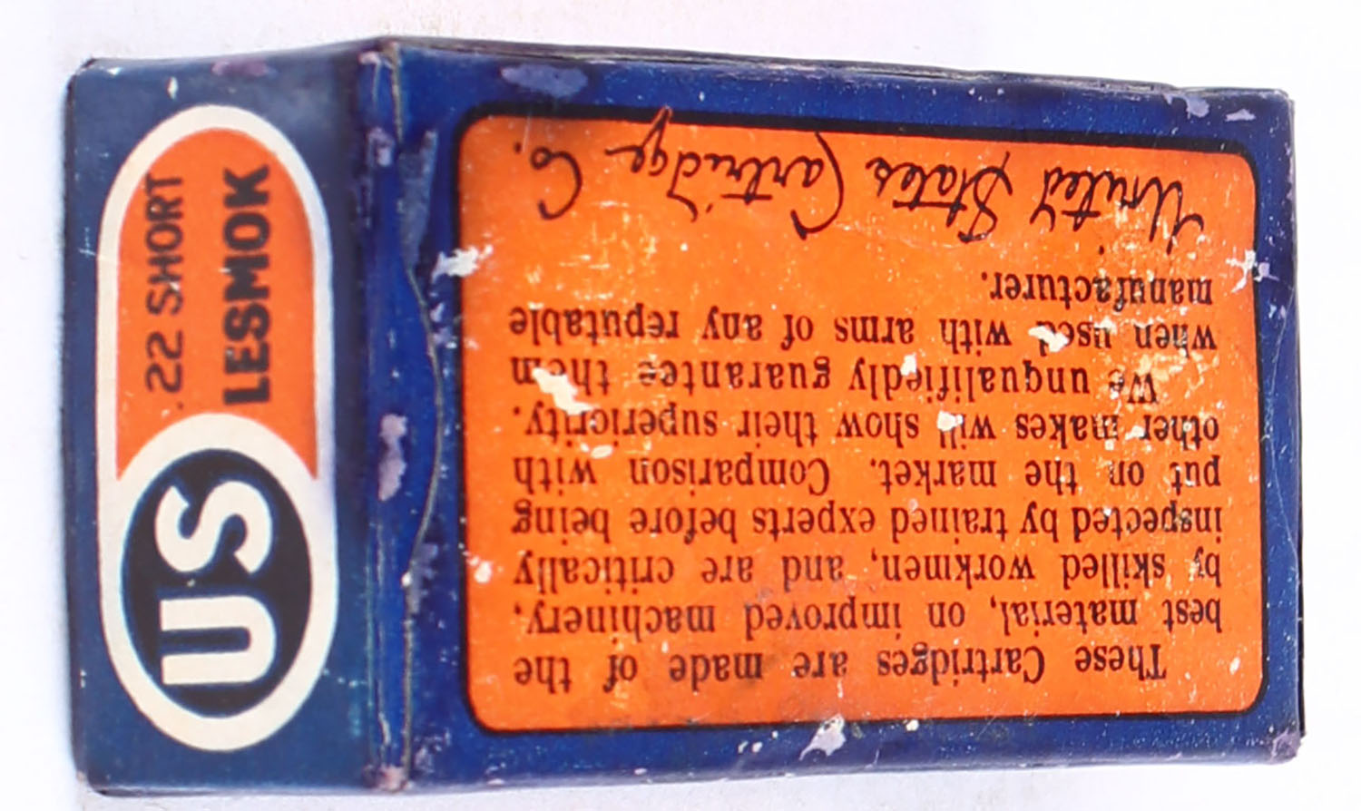 U.S., Lesmok Cartridges, .22 Short, Rifle Cartridges, RHWeb: US-50 S-12, FULL & SEALED, 1pc. Blue orange & white box with blue & orange side sealing label, box is solid with excellent color, box has edge & corner wear that has been color repaired, side sealing label is intact. Grade: Very Good ++ - Value: 20 to 30