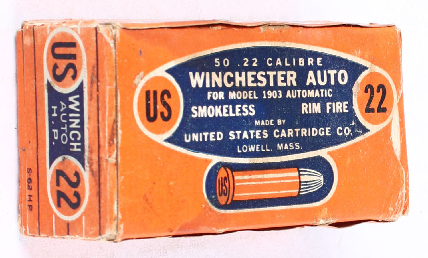 U.S., Smokeless Rim Fire, .22 Winchester Auto. Hollow Point, RHWeb: US-8 WA-2, Partial 3rds., 1pc. Orange blue & white box, box is solid with very good color, some staining on top, minor edge & corner wear, end flaps are solid, ammo is excellent. Grade: Very Good + - Value: 10 to 15
