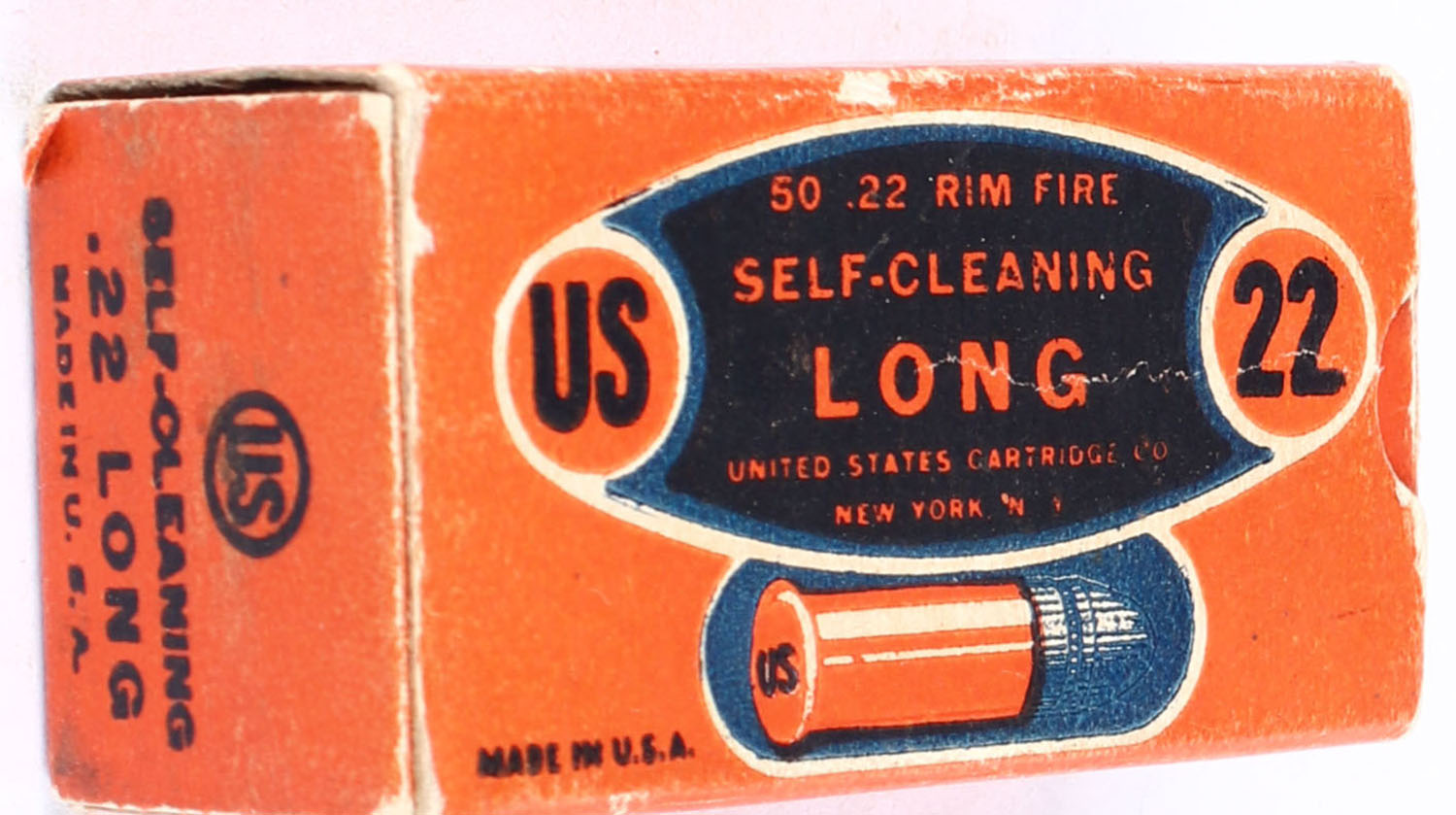 U.S., Self-Cleaning, .22 Long, Coppered Bullet, RHWeb: US-10B L-4, Partial 24rds. 1pc. Orange & black box, box is solid with excellent color, minor edge & corner wear, end flaps are solid, ammo is excellent. Grade: Excellent - Value: 10 to 15