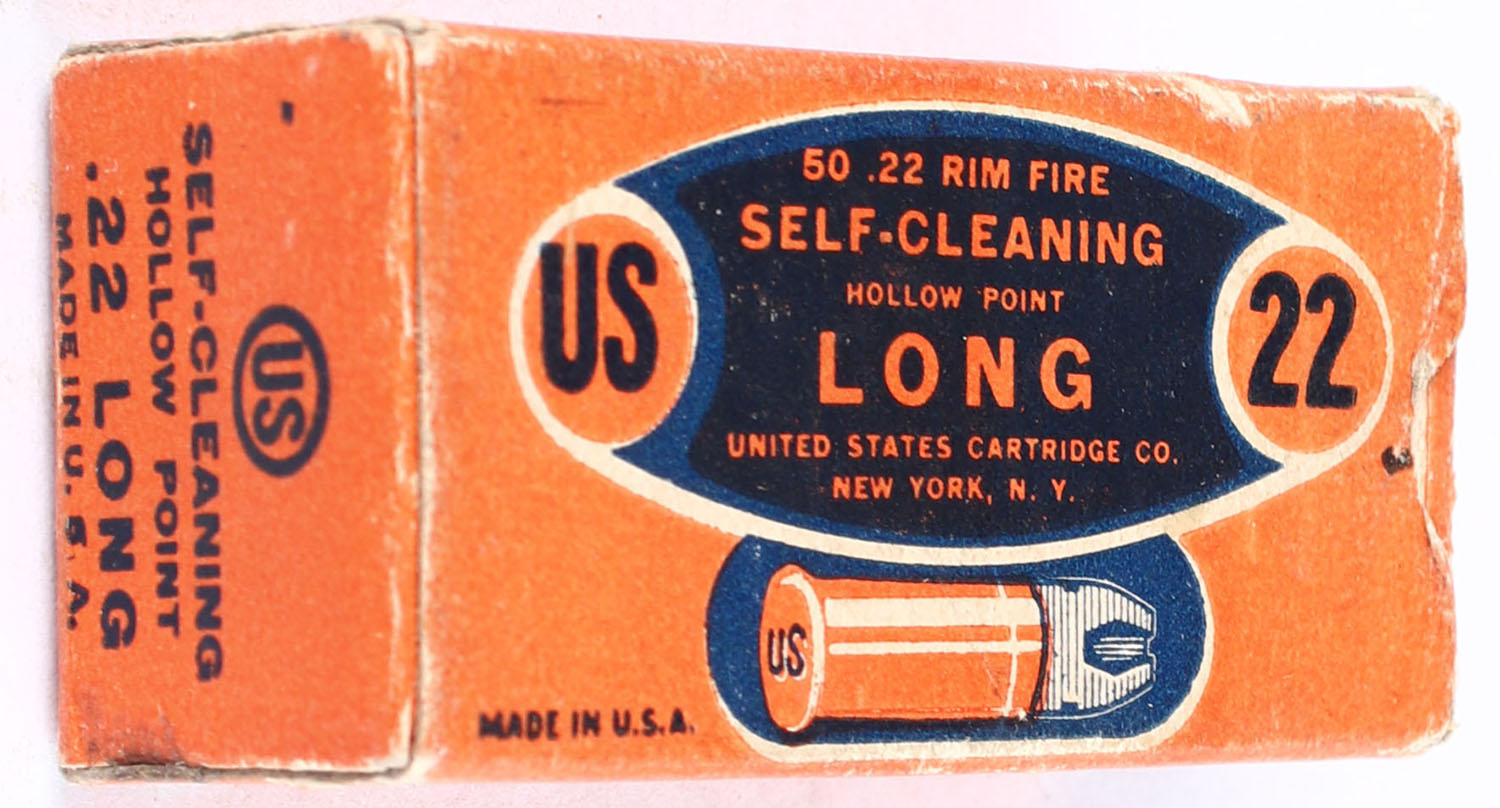 U.S., Self-Cleaning, .22 Long, RHWeb: US-10A L-2, Partial 44rds. 1pc. Orange & black box, box is solid with very good to excellent color, minor age soiling some edge & corner wear, end flaps are solid, ammo is very good. Grade: Very Good + - Value: 50 to 75