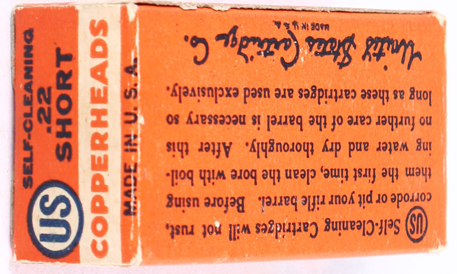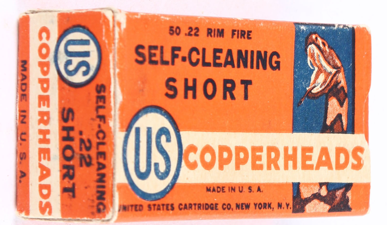 U.S., Copperheads, .22 Short, Self-Cleaning, RHWeb: US-12 S-1b, Full 1pc. Orange white & blue box, box is solid with excellent color, very minor age soiling, minor corner wear, edges are crisp, end flaps are solid, ammo is excellent. Grade: Excellent - Value: 60 to 90