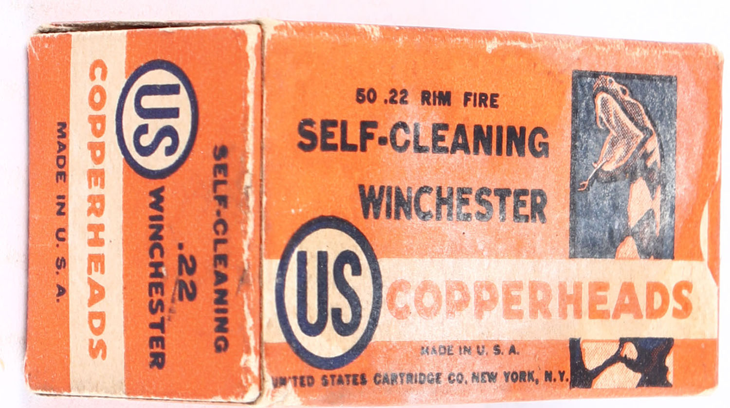 U.S., Copperheads, .22 Winchester Rim Fire, Self-Cleaning, RHWeb: US-12 WRF-1b, Full, 1pc. Orange white & blue box, box is solid with very good color, some shelf & corner wear, very minor edge wear, end flaps are solid, ammo is very good. Grade: Very Good + - Value: 30 to 45