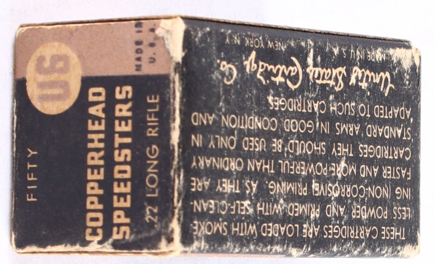 U.S., Copperhead Speedsters, .22 Long Rifle, RHWeb: US-13 LR-1c, Full, 1pc. Black & brown box, box is solid with very good color, minor age soiling, some edge & corner wear, end flaps are solid, ammo is excellent. Grade: Very Good + - Value: 16 to 50