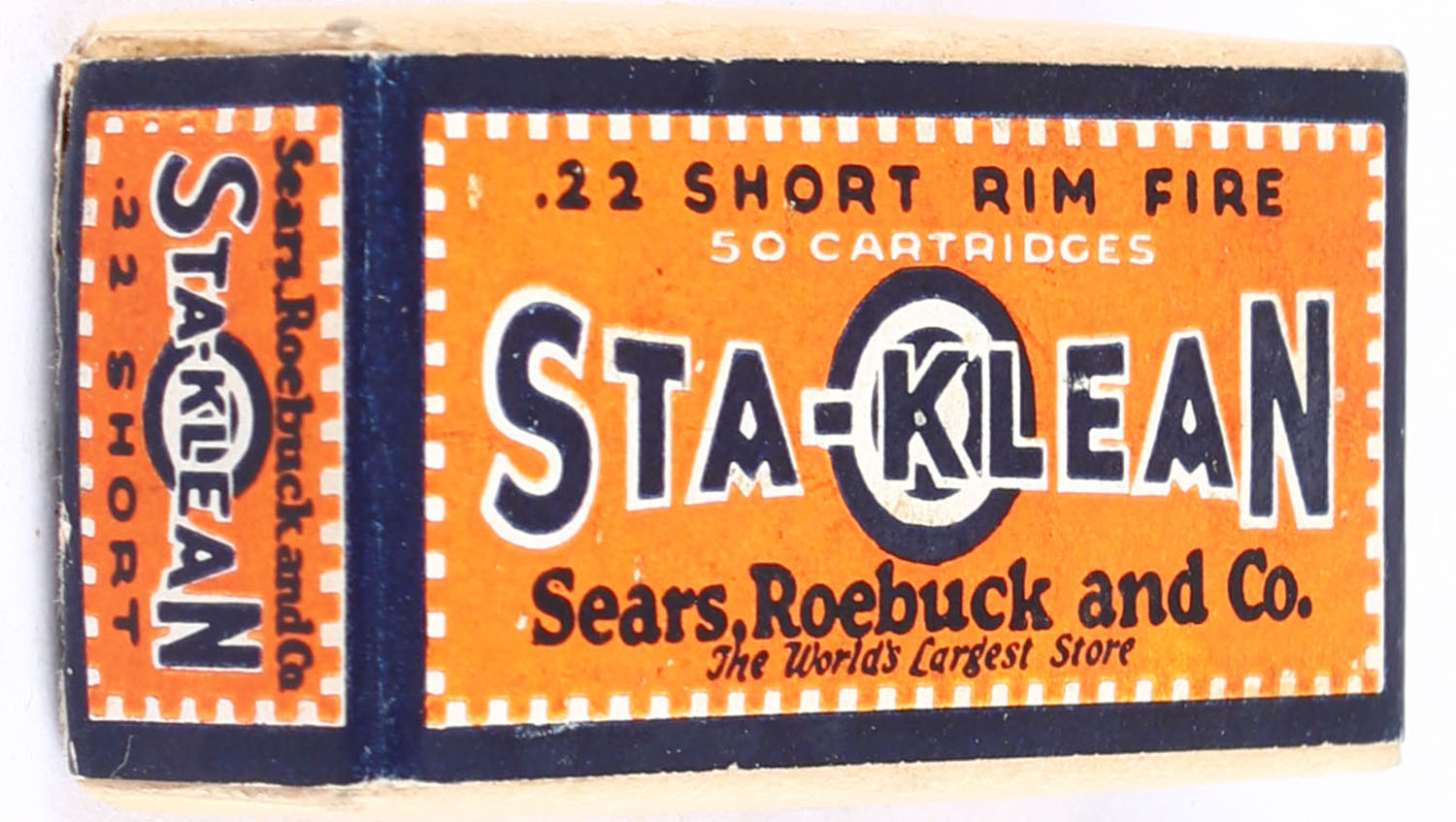 Sears, Sta-Klean, .22 Short, RHWeb: SEARS-1 S-1, Full, 2pc. Buff box with orange & blue wraparound label, box is solid with excellent to minty color, very minor corner wear, edges are crisp, end flaps are solid, ammo is excellent to minty. Grade: Excellent ++ - Value: 40 to 60