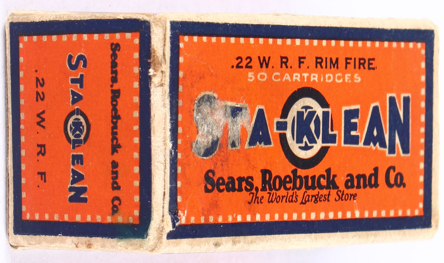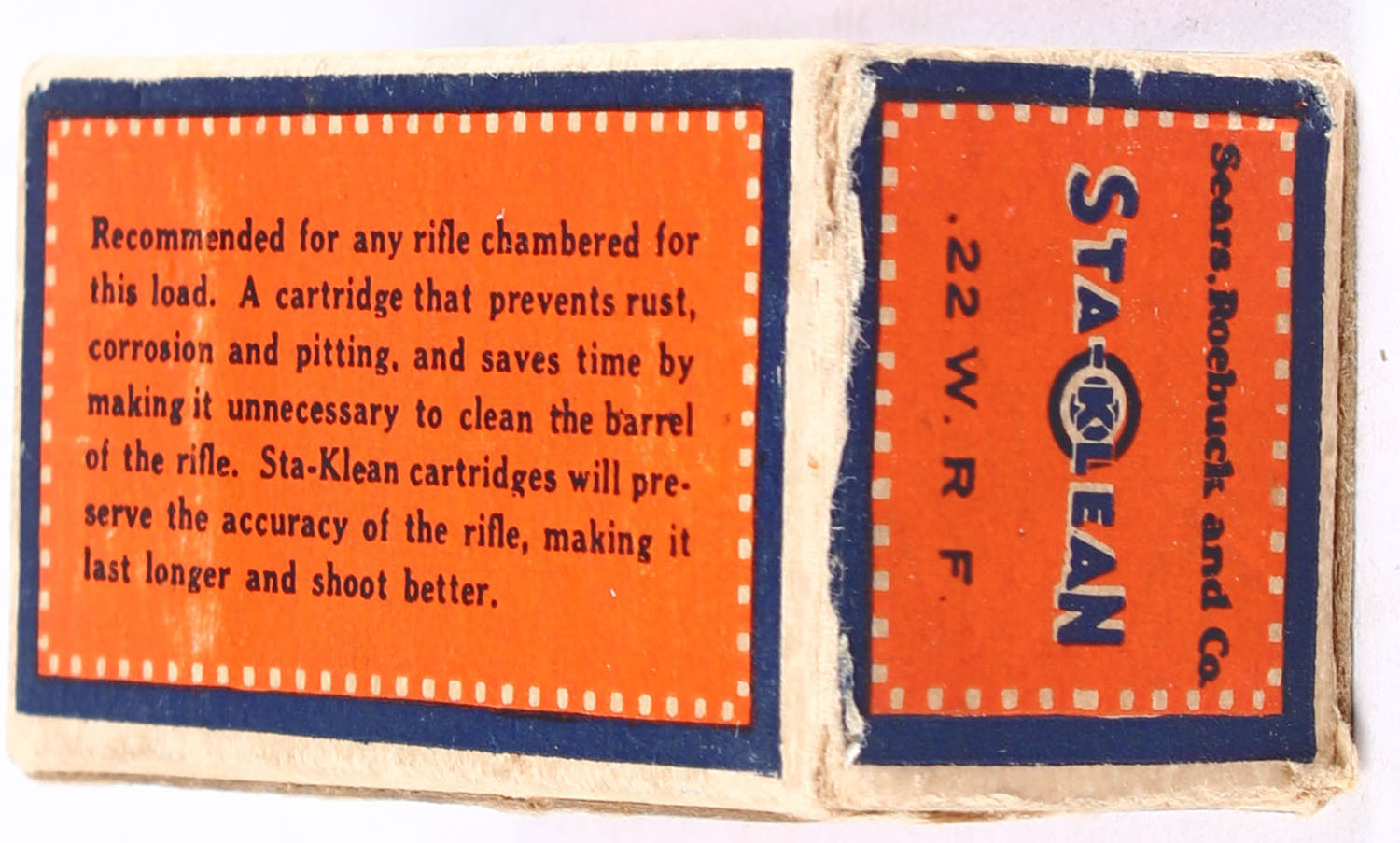 Sears, Sta-Klean, .22 W.R.F., RHWeb: SEARS-2 WRF-1, Partial 35rds. 1pc. Orange blue & buff box, box is solid with very good color, some age soiling, scuff on top, some corner wear, very minor edge wear, end flaps are solid, ammo is excellent. Grade: Very Good - Value: 16 to 24
