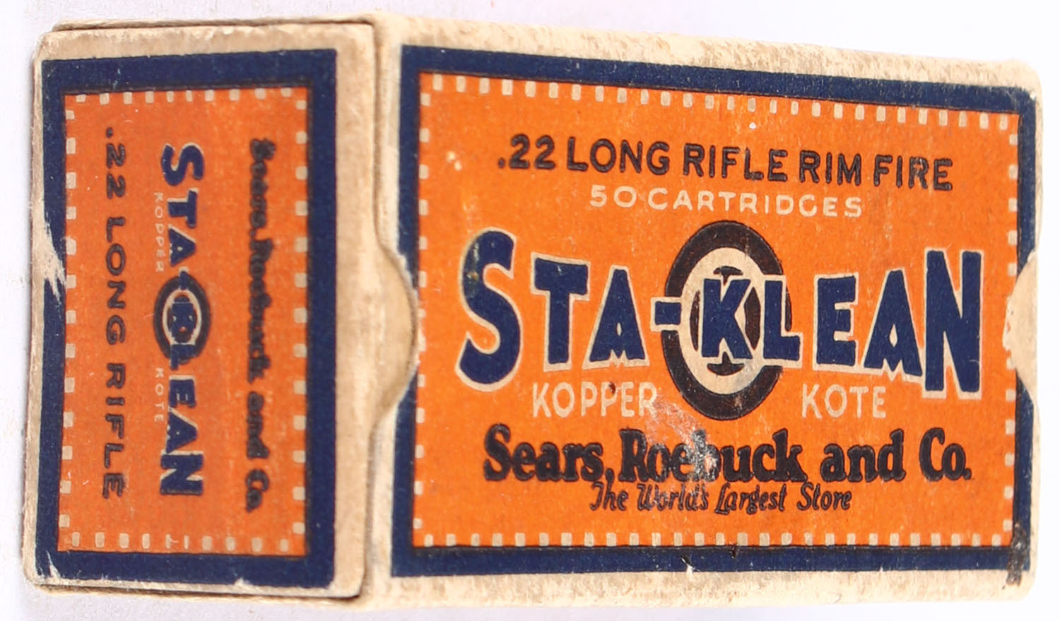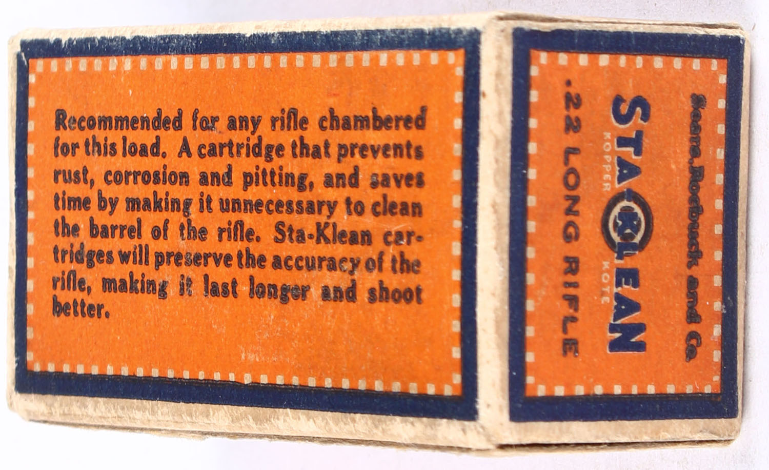 Sears, Sta-Klean Kopper Kote, RHWeb: SEARS-3 LR-1c, Full, 1pc. Orange blue & buff box, box is solid with very good color, some age soiling, very minor corner wear, edges are crisp, end flaps are solid, ammo is excellent. Grade: Very Good ++ - Value: 10 to 15