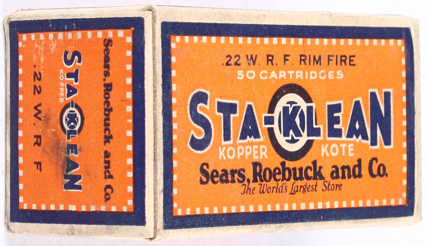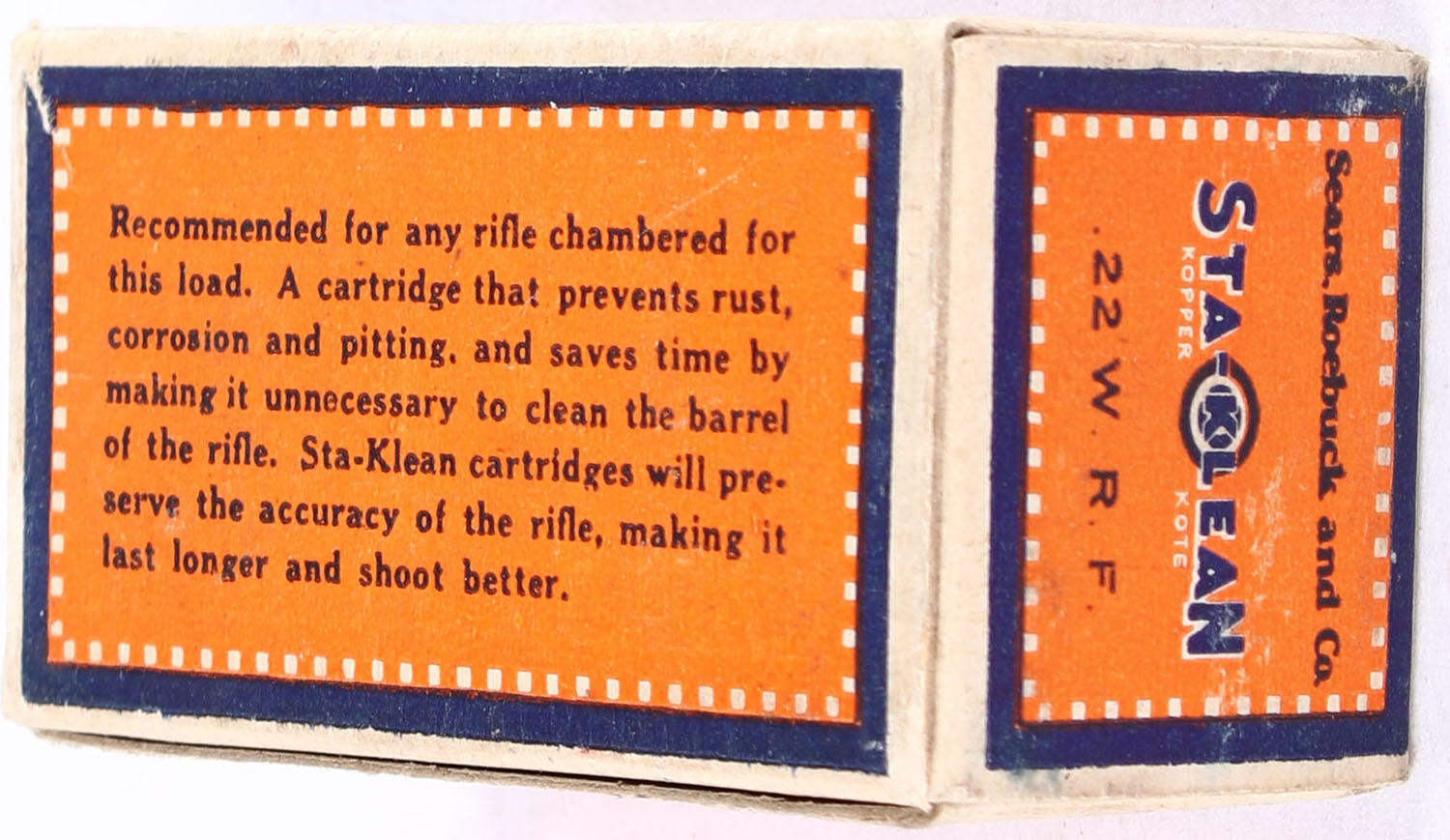 Sears, Sta-Klean Kopper Kote, .22 W.R.F., RHWeb: SEARS-3 WRF-1b, Partial 27rds. 1pc. Orange blue & buff box, box is solid with very good to excellent color, minor age soiling & corner wear, very minor edge wear, end flaps are solid, ammo is excellent. Grade: Very Good ++ - Value: 16 to 24