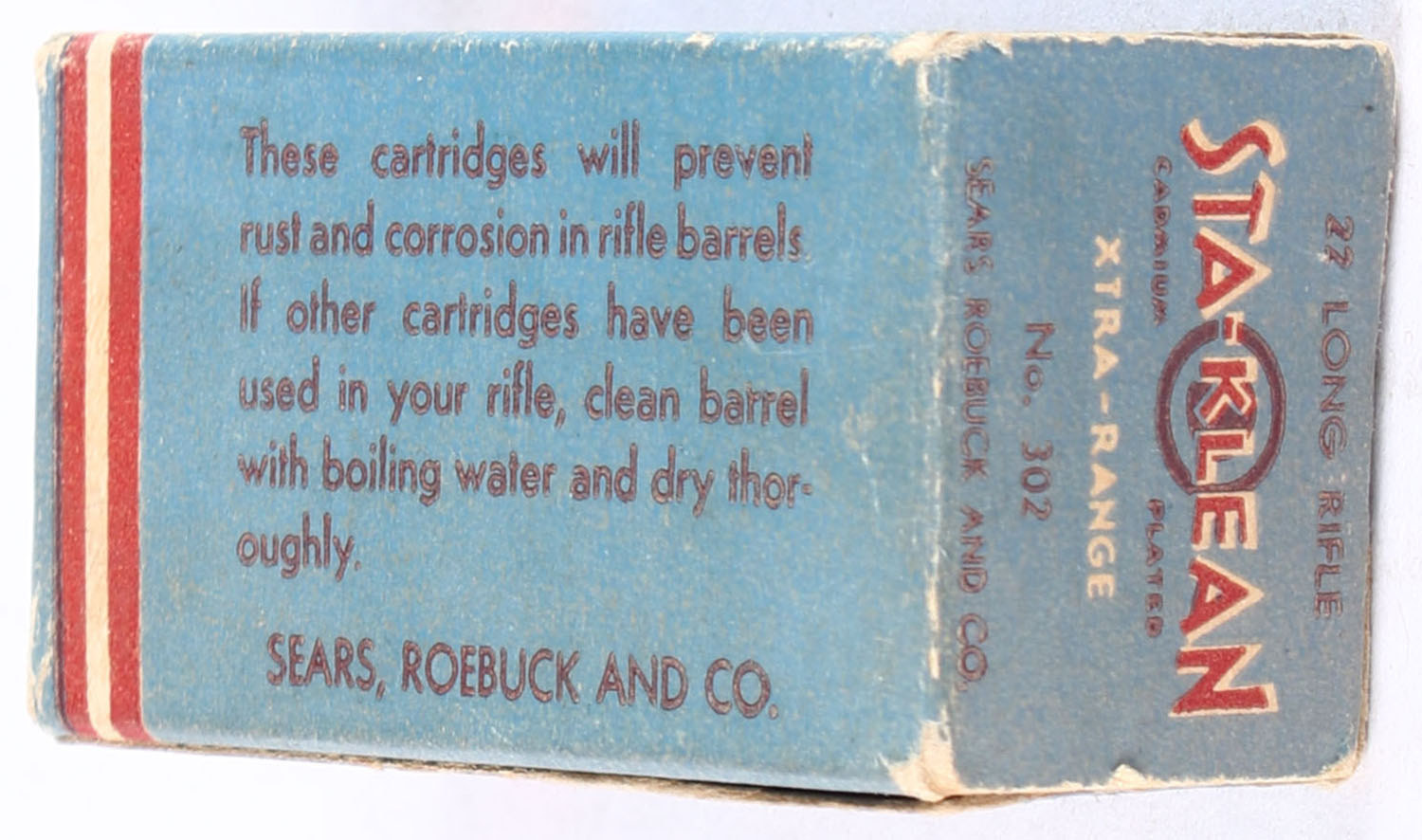 Sears, Sta-Klean Cadmium Plated, .22 Long Rifle, RHWeb: SEARS-4 LR-1a, Full of *incorrect ammo (correct H/S, box is full of cadmium plated hollow points), 1pc. Blue maroon & white box, box is solid with very good color, some color fading, minor corner wear, edges are crisp, end flaps are solid, ammo is excellent. Grade: Very Good ++ - Value: 30 to 45