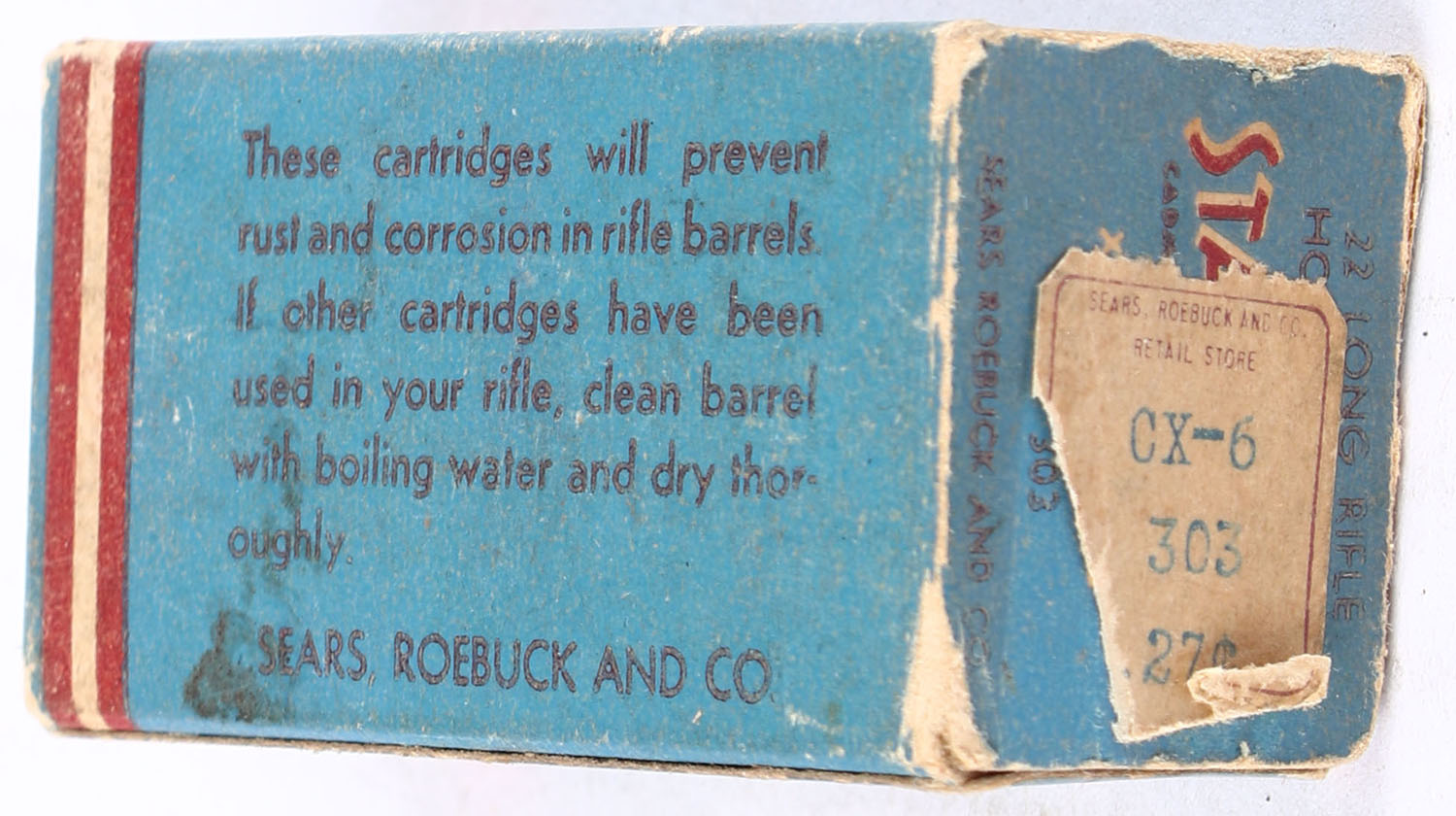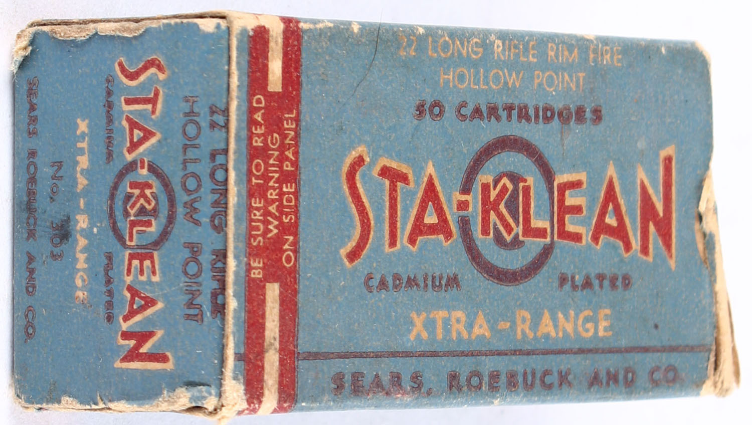 Sears, Sta-Klean Cadmium Plated, .22 Long Rifle Hollow Point, RHWeb: SEARS-4 LR-3, Full, 1pc. Blue maroon & white box, box is solid with good to very good color, age soiling, some corner wear, very minor edge wear, partial tear to insert tab of right end flap, left end flap is solid, ammo is excellent. Grade: Very Good - Value: 20 to 30