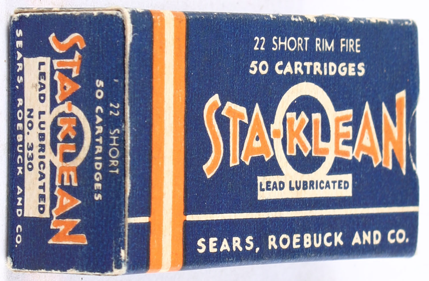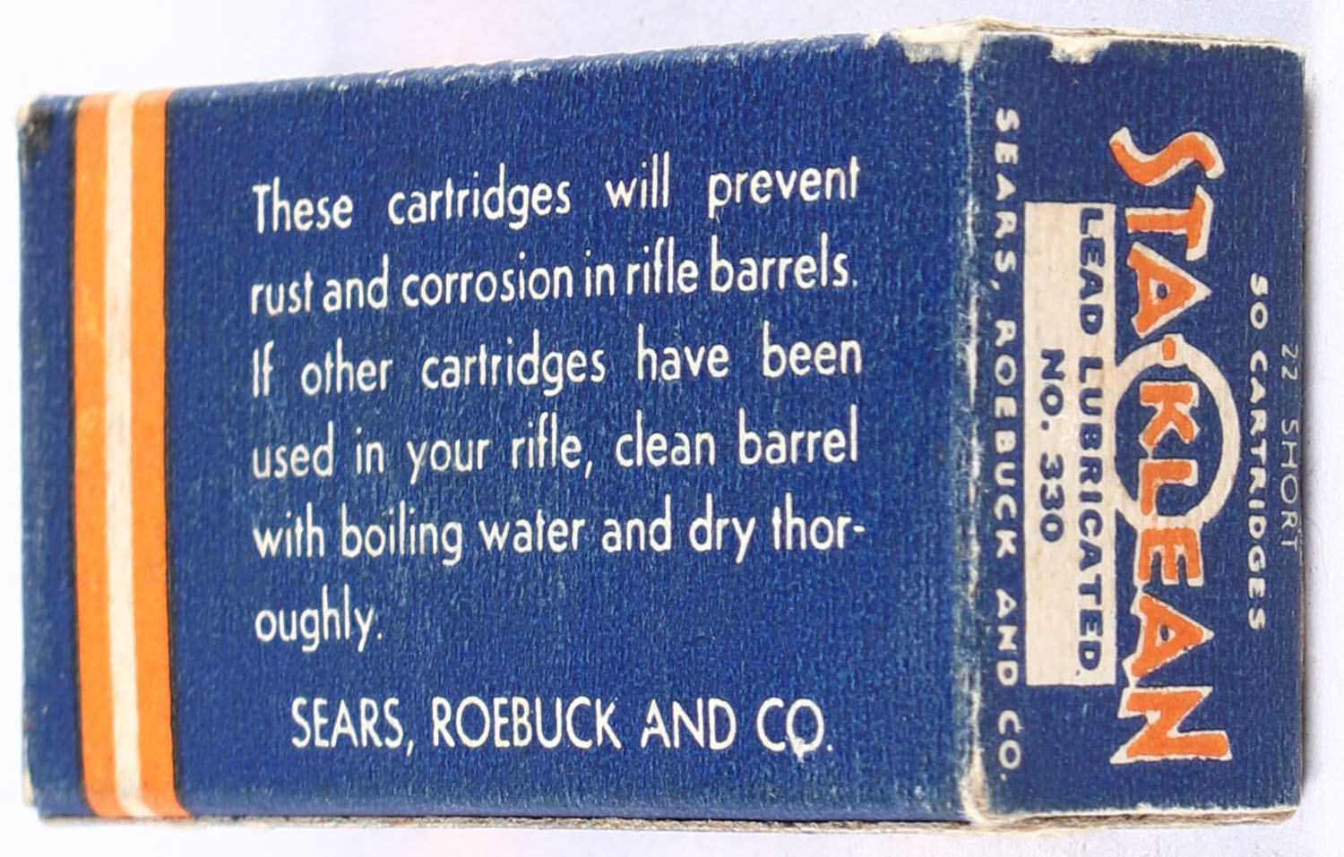 Sears, Sta-Klean, .22 Short, Lead Lubricated, RHWeb: SEARS-5 S-1a, Partial 42rds., 1pc. Blue orange & white box, box is solid with excellent color, very minor age soiling & corner wear, edges are crisp, end flaps are solid, ammo is excellent. Grade: Excellent + - Value: 10 to 15