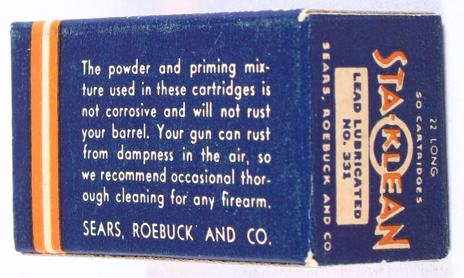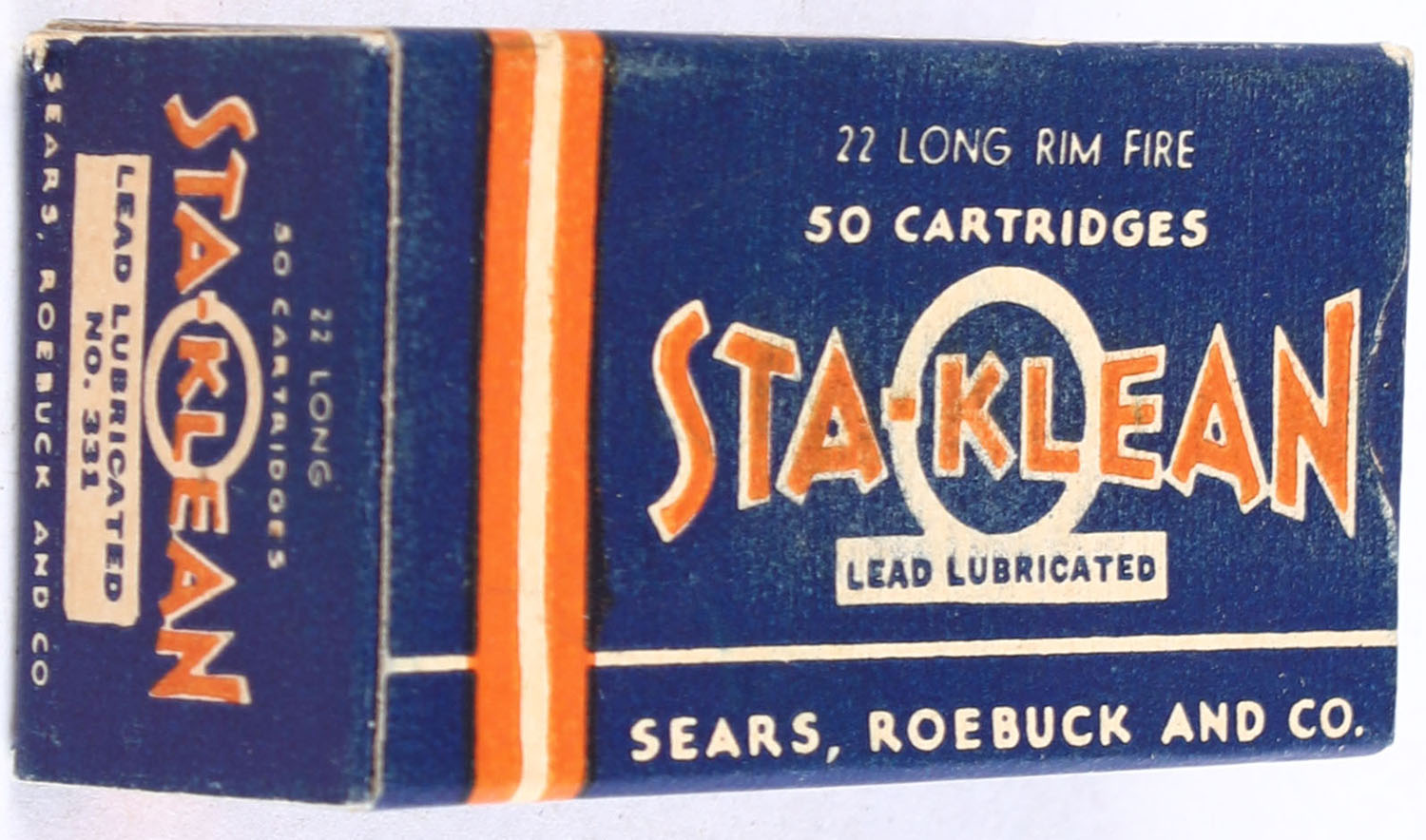 Sears, Sta-Klean, .22 Long, Lead Lubricated, RHWeb: SEARS-5 L-1b, Full, 1pc. Blue orange & white box, box is solid with excellent color, minor shelf wear, very minor corner wear, edges are crisp, end flaps are solid, ammo is excellent. Grade: Excellent + - Value: 20 to 30