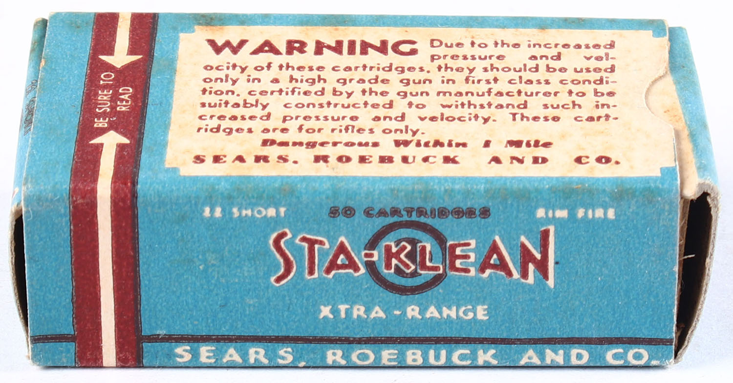 Sears, Sta-Klean, .22 Short, Lead Lubriacted, RHWeb: SEARS-6 S-4c, Full, 1pc. Blue white & maroon box, box is solid with very good to excellent color, some age soiling on top, very minor corner wear, end flaps are solid, ammo is excellent. Grade: Excellent - Value: 20 to 30